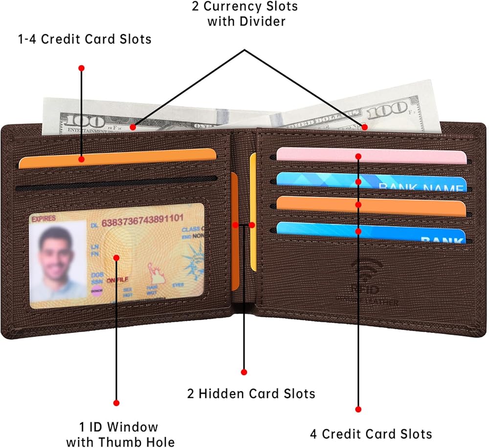 Ample Space: The bifold wallets for men offers 7 card slots, an ID window, and 2 bill sections, providing ample space for cash and cards while keeping a sleek design; it measures 4.5 x 3.5 x 0.35 inches, making it easy to fit in your pocket