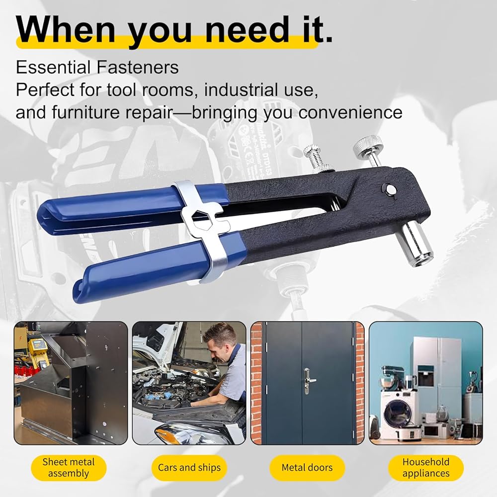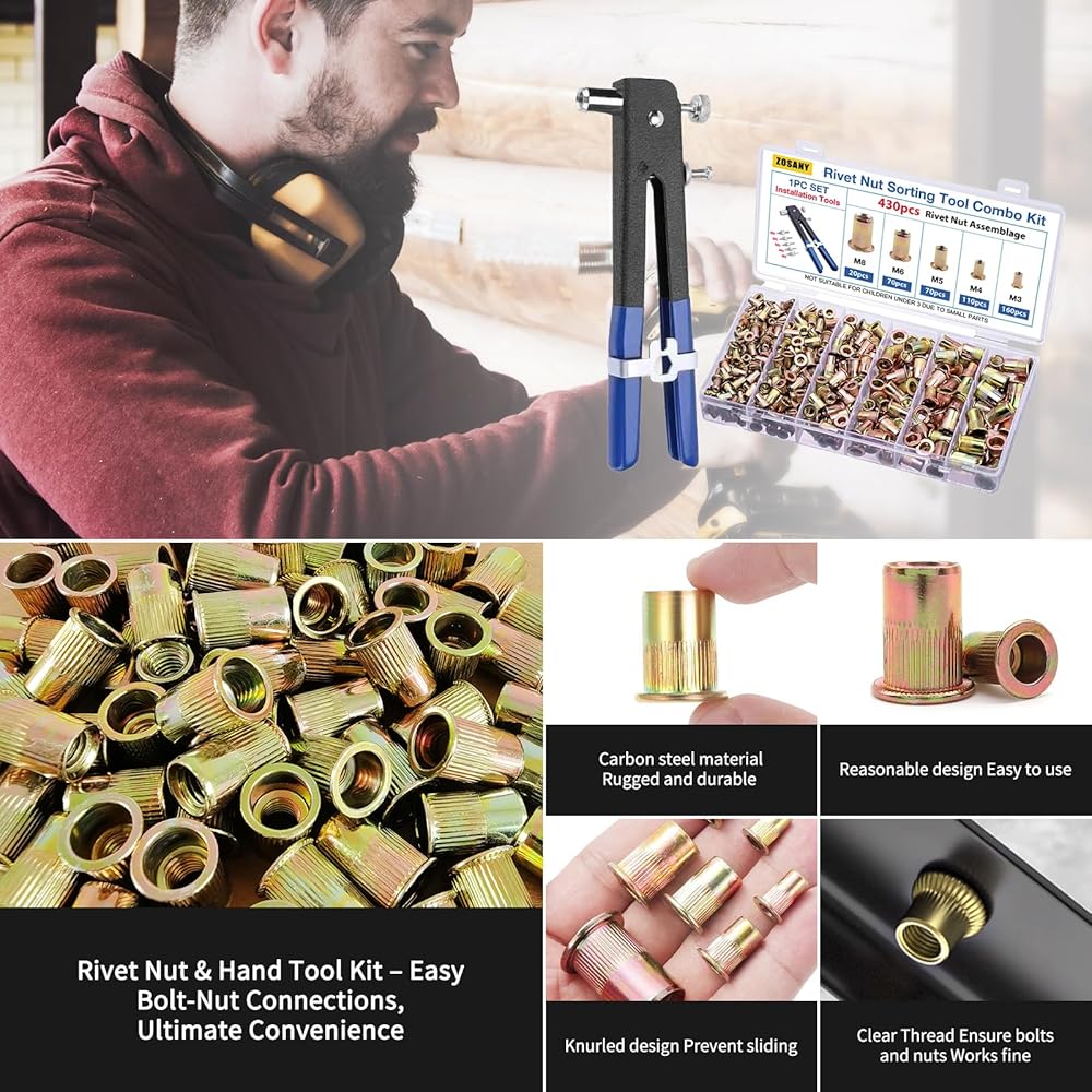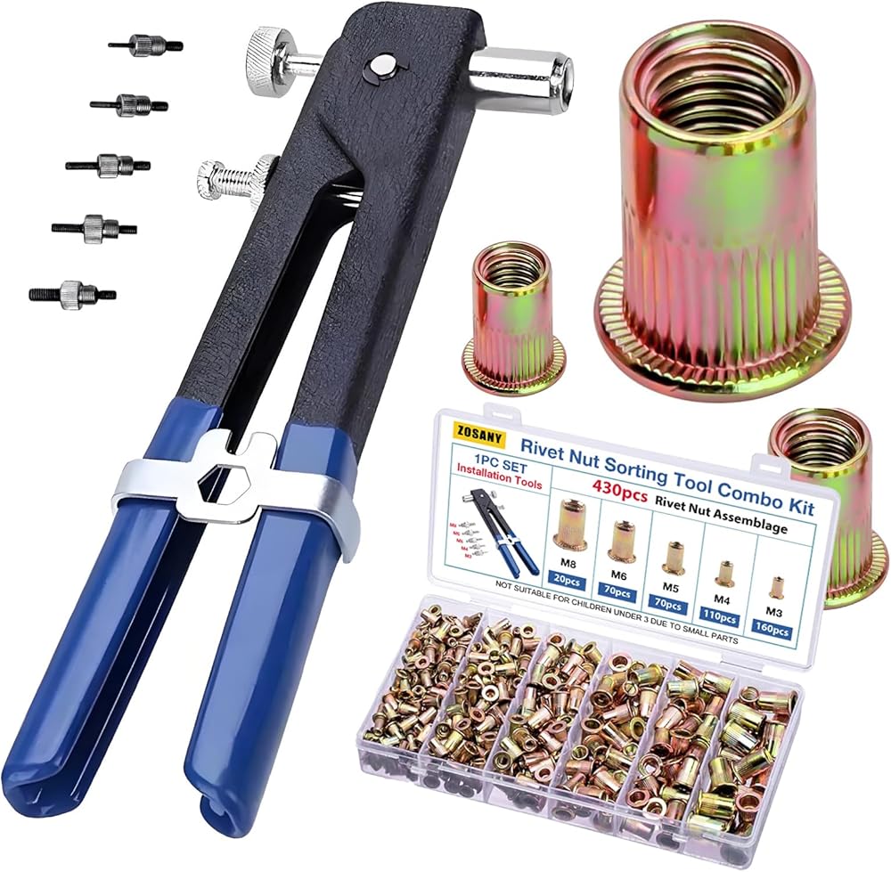 Pressure Rivet Nut Tool Kit with 5 Metric Mandrels and 430Pcs Rivet Nuts, Suitable for Automotive, Furniture, Upholstery, Marine and Other Applications