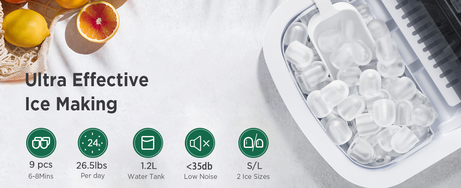 FAST ICE MAKER: The Silonn countertop ice maker only takes 6 minutes to make 9 bullet-shaped ice cubes. Fill the water into the water tank, maximum ice capacity can reach 26 pounds in 24 hours.