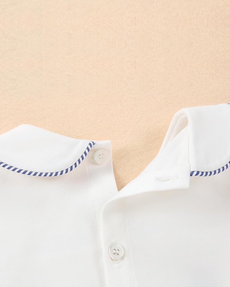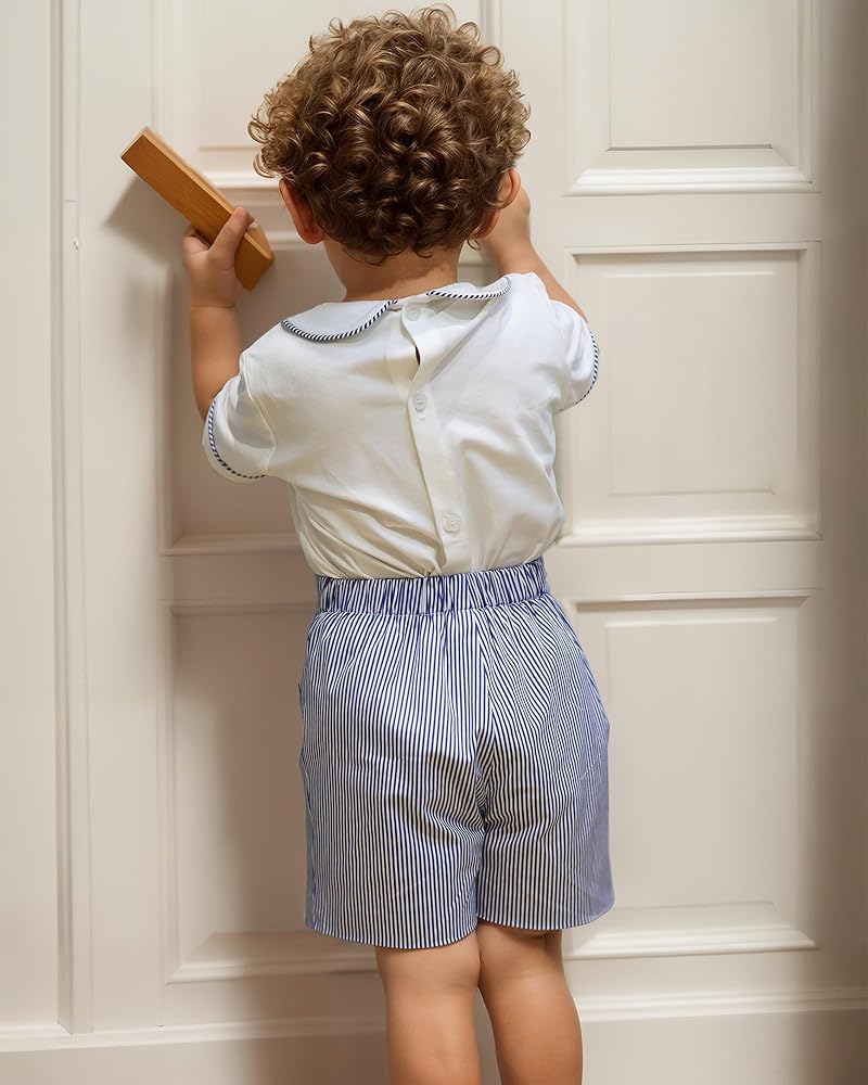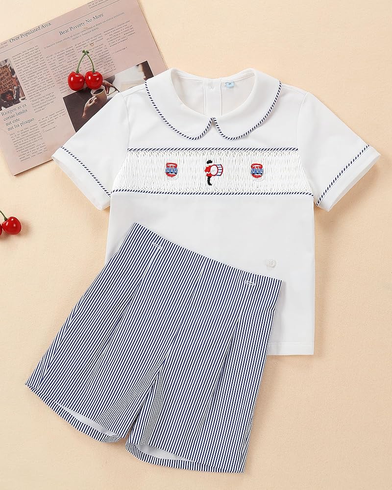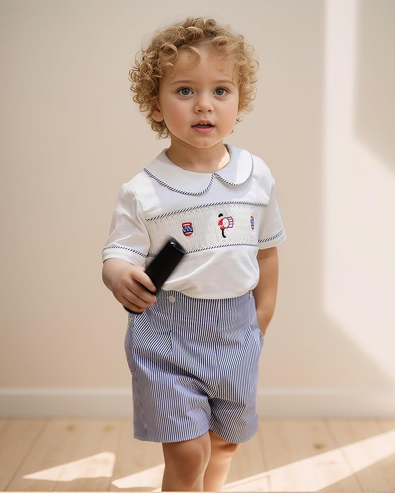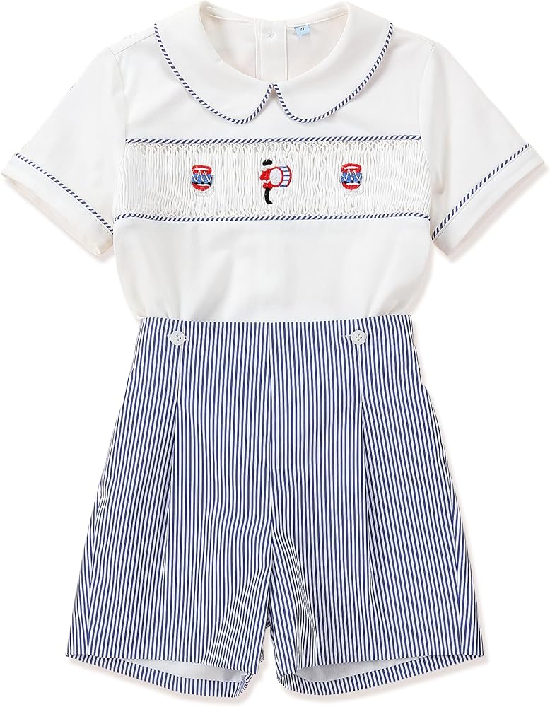 This is a unique summer Short Sleeve boys' 2-Piece outfit set。The boys' button-down shirts is Smocked。This is a retro decorating method From the British Royal Family。The short pants have elastics at the waist and at the bottom。It is very easy to wear,suitable for different figures. The baby boy suit is designed as short sleeve buttons shirt and shorts to ensure your children comfortable all day in summer. The Smocked and Embroidery is traditional and cute。 The shirts is high-grade cotton .It is made of 100% cotton, which is more soft, breathable, light, stylish and smooth for your daily wear。 THE lining is also is100%Cotton soft and comfortable, breathable and lightweight, skin-friendly, suitable for baby Toddler and kids. no any not irritating to your baby's skin。 This is a super cute two-Piece set for your boy! It is Suitable for summer outdoor wear and daily wear,perfect for any occasions such as party,school,kindergarten,photography, birthday, park ,holiday, beach etc. It is a great gift for your baby or as a birthday gift.