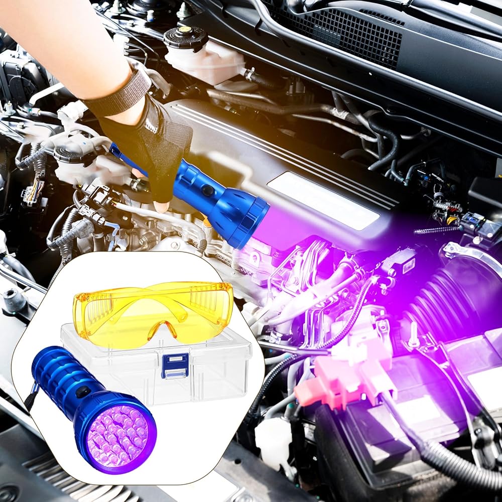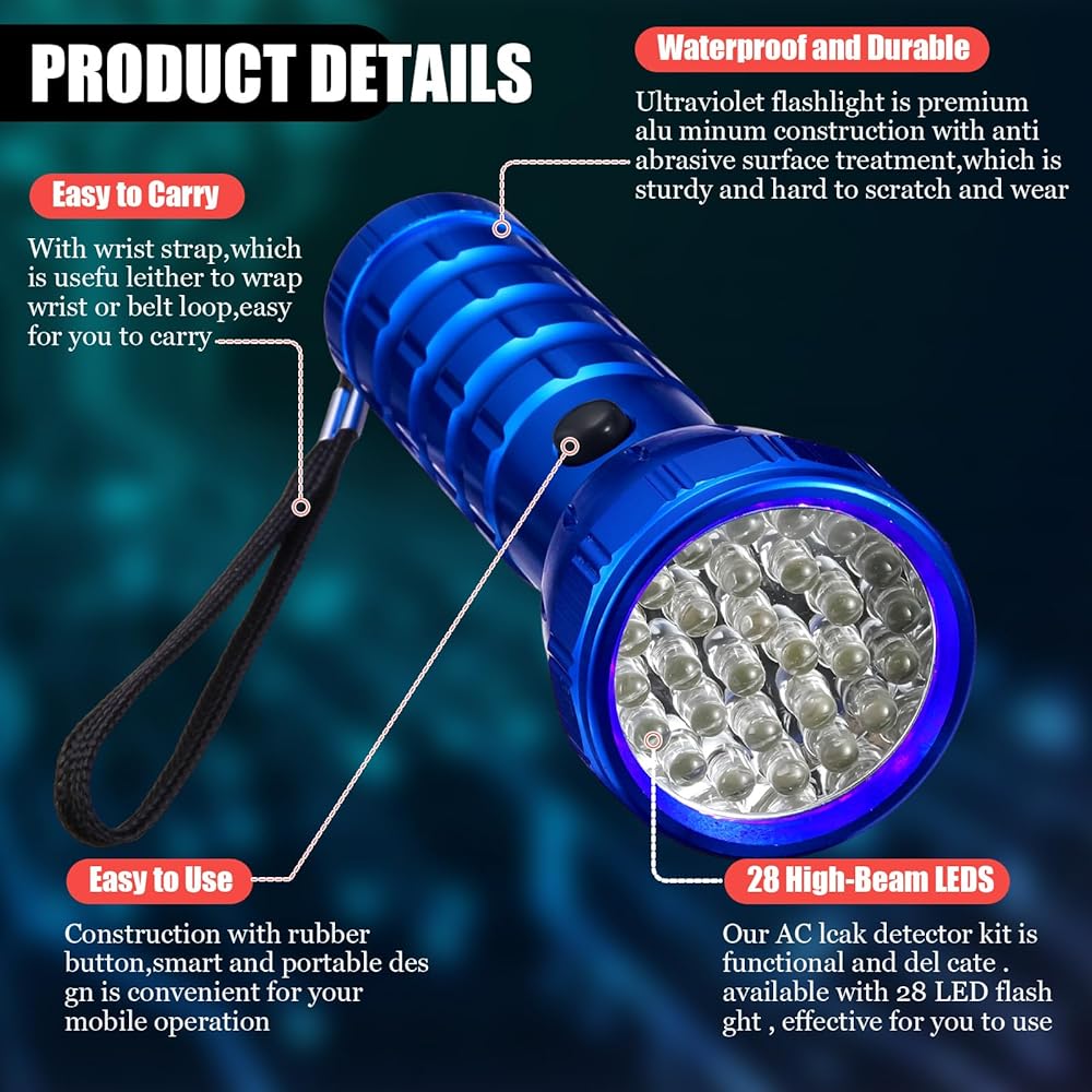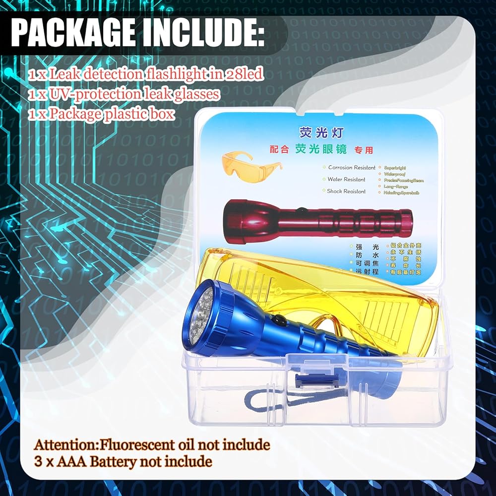 Our air conditioner stop leak detector kit is crafted to provide functionality. Made from quality materials, the kit contains a flashlight built from aluminum alloy, known for its strength and durability, plus a pair of protectively designed plastic glasses. The flashlight emits a strong light from a distance of approximately 300 meters, ensuring that you can easily detect leaks even in the most obscured corners.