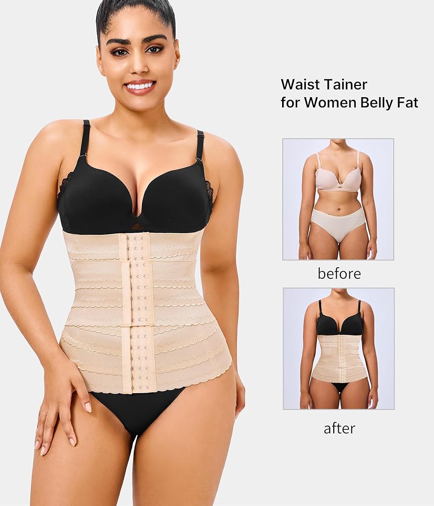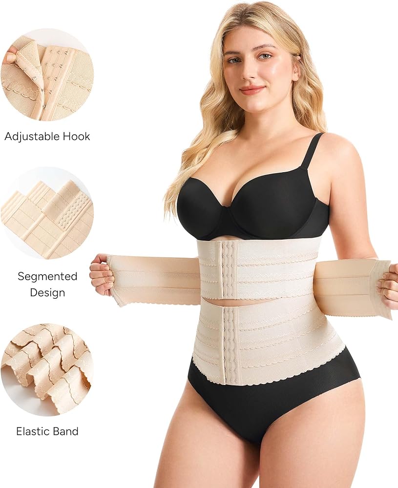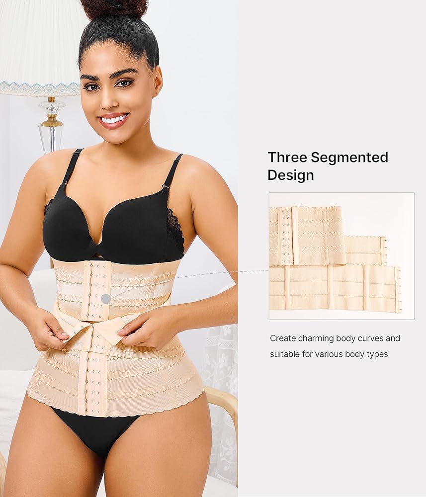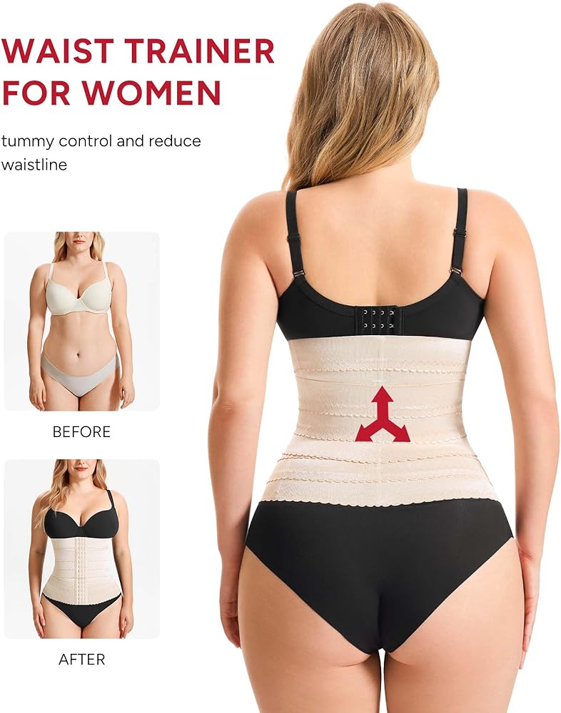 Segmented Waist Trainer. Waist trainer for women lower belly fat features a unique three-segment belt structure with a 3-row hook closure that allows for precise adjustment according to your comfort level during different stages of body shaping. The segmented design cinches the waist at its slimmest part and strengthens abdominal control, allows for free movement while effectively reducing waistline.