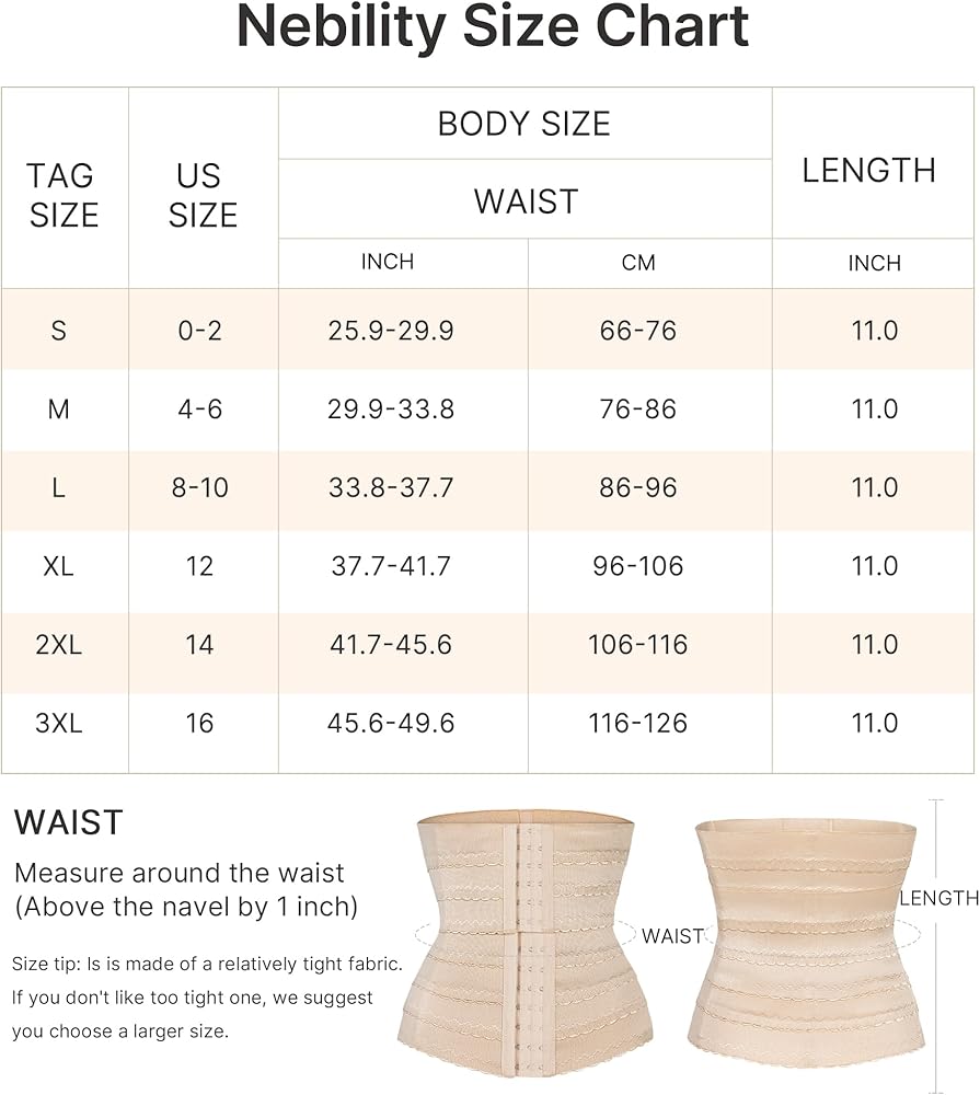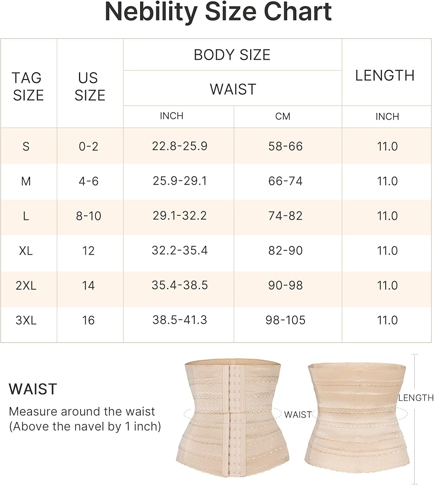 Size Selection Instructions. Measure your waist at its slimmest part and compare it with our size chart: S (25.9-29.9 inches), M (29.9-33.8 inches), L (33.8-37.7 inches), XL (37.7-41.7 inches), 2XL (41.7-45.6 inches), and 3XL (45.6-49.6 inches). Nebility women waist trainer is designed with higher compression, so it will feel quite snug. If you're between sizes, we recommend choosing the larger size for added comfort.