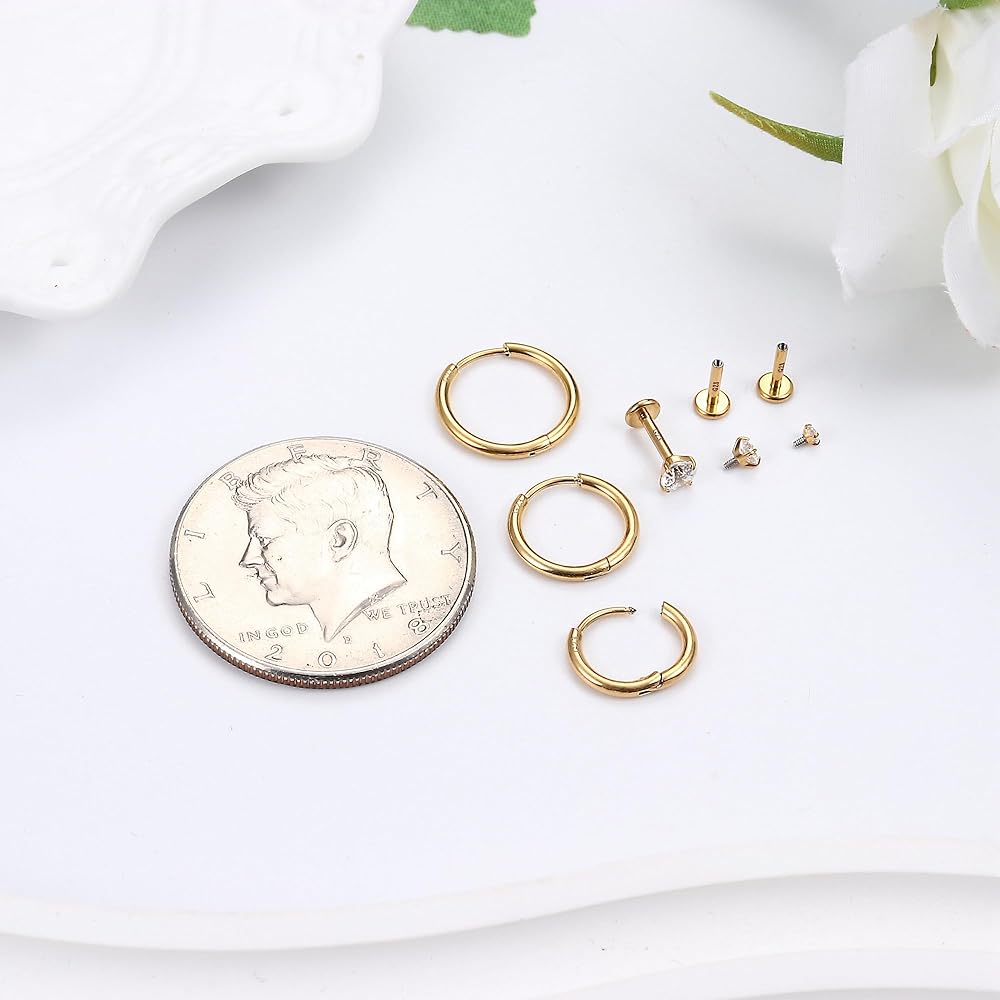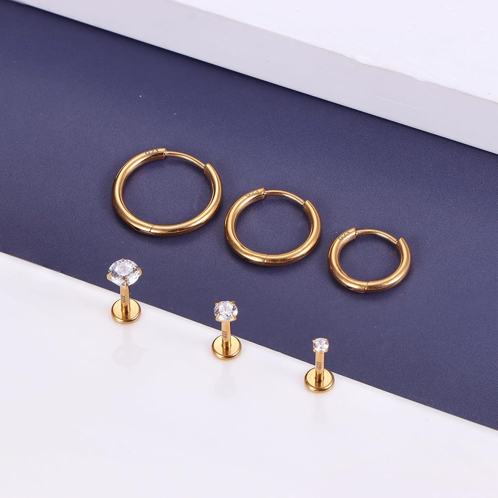 【Labret Piercing Set】3Pcs Internal Threaded Labert Stud and 3Pcs Hoop Earrings One Set. Different CZ Size in 2mm, 3mm, 4mm and Hoop Inner Diameter in 8mm, 10mm, 12mm. Titanium Piercing Jewelry Set for Tragus Piercing Jewelry, Helix Piercing, Cartilage Earring, Nose Stud Rings, Lip Ring, Conch Diath Medusa Monroe Piercing Jewelry.