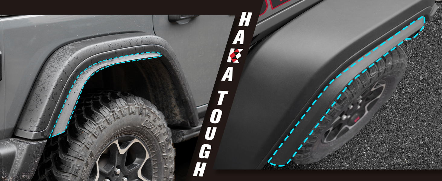 Uncompromising Toughness: HAKA TOUGH's fender flares for Jeep Wrangler are crafted to endure. They offer your Jeep the kind of robust protection that stands up to rocky trails, muddy paths, and all of the rugged adventures you can throw at them.