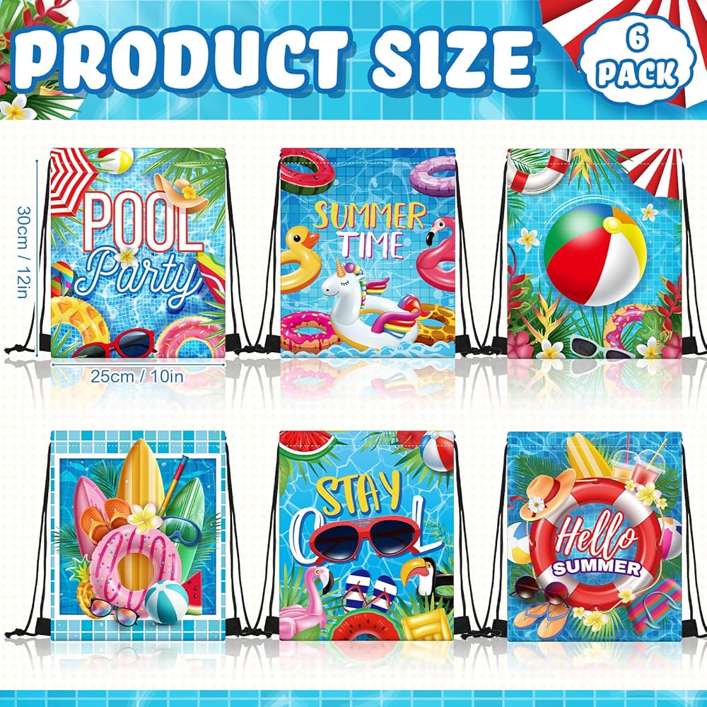 Pool Party Supplies: you will receive 12 pieces pool drawstring party favors bags in 6 styles, 2 for each style; And the quantity is enough for you to use and replace in daily life or parties, or just share with others