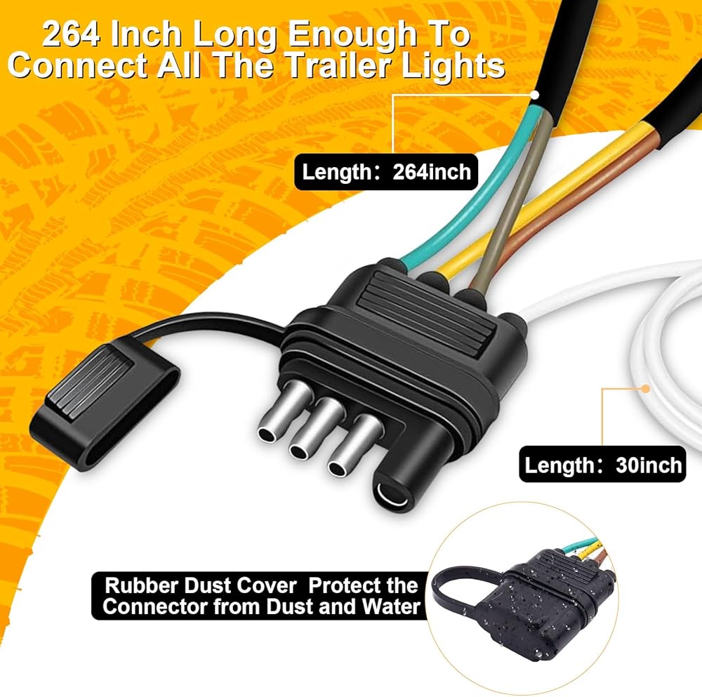 【Perfect Size 】4 pin trailer wiring harness is designed with a 22ft male 4 flat wire and a 2.5ft ground wiring, offering ample length to accommodate different installation needs and trailer rewiring projects, thereby streamlining the setup procedure.