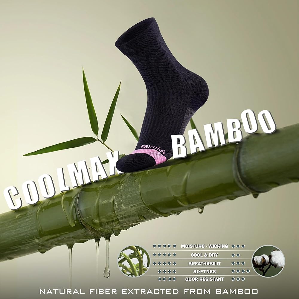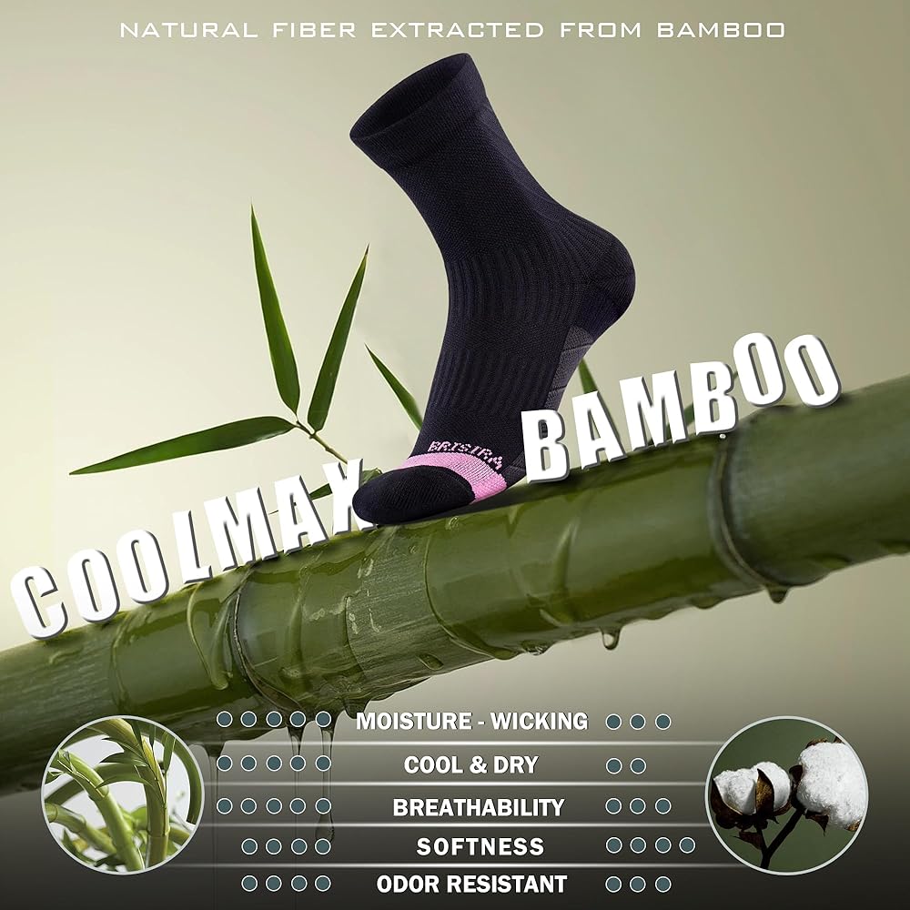 Premium Plants Viscose & CoolMax Fiber - Brisira compression socks for women meticulously crafted using high-quality Coolmax and Plants Viscose materials, known for their exceptional softness, breathability, and durability. Brisira womens socks are ideal for daily work, running, cycling and other sports.