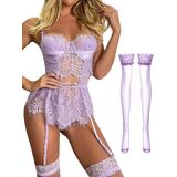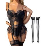 Lilosy Sexy Stocking Underwire Babydoll Lace Mesh Garter Lingerie Set with Panty 4 Piece