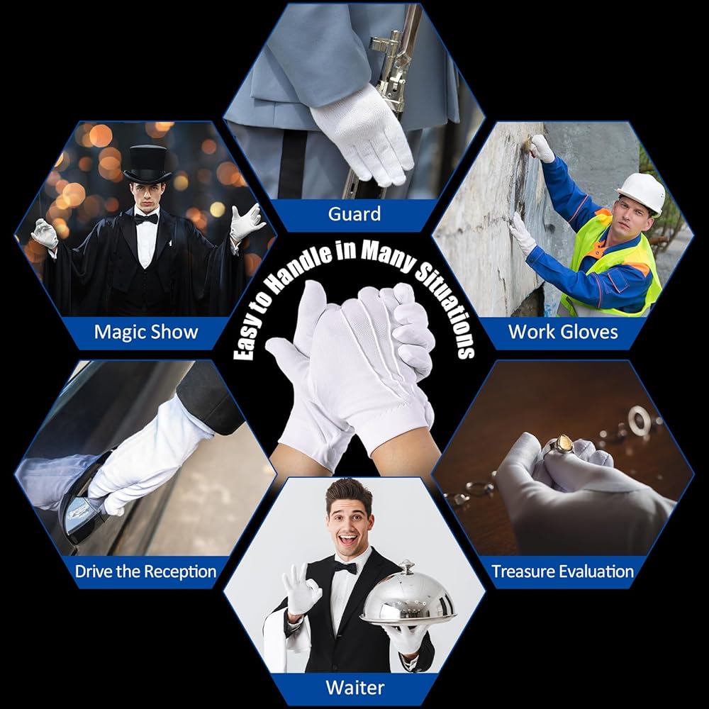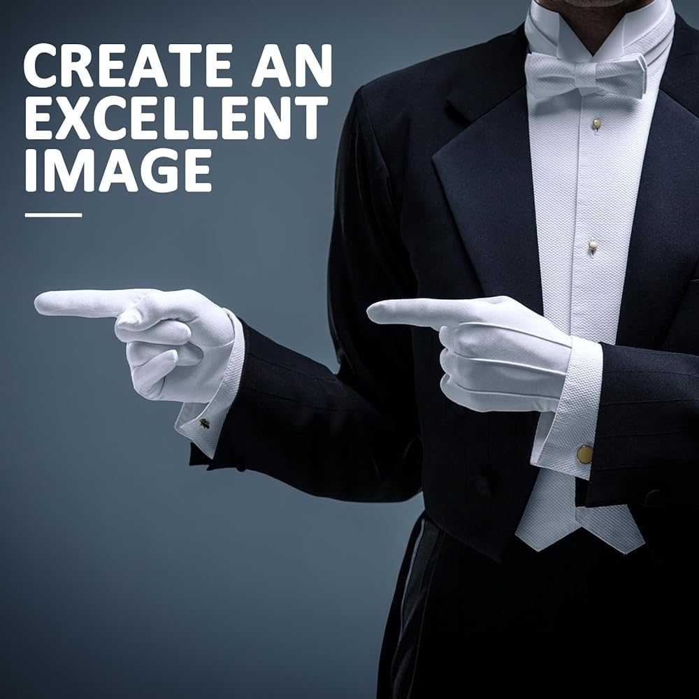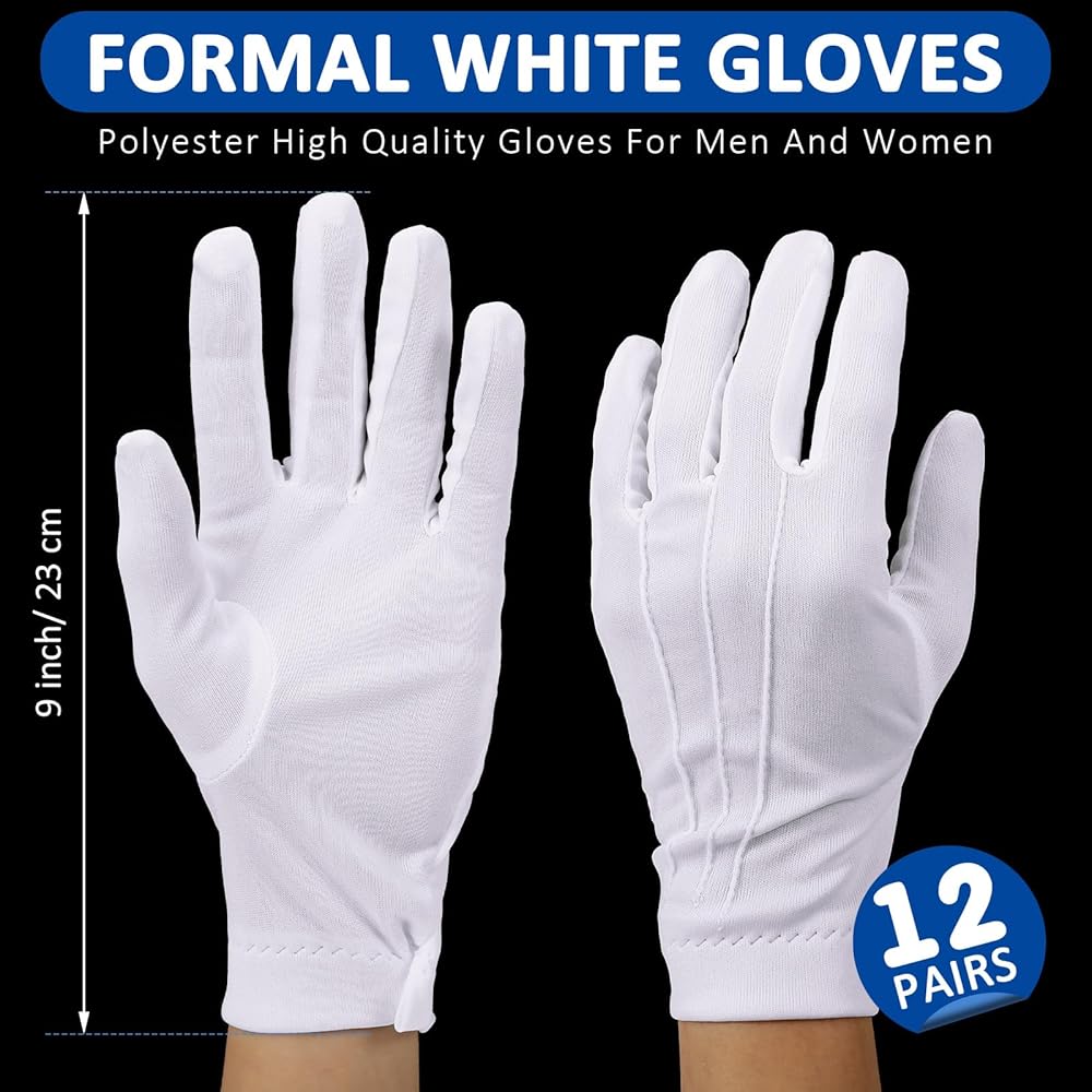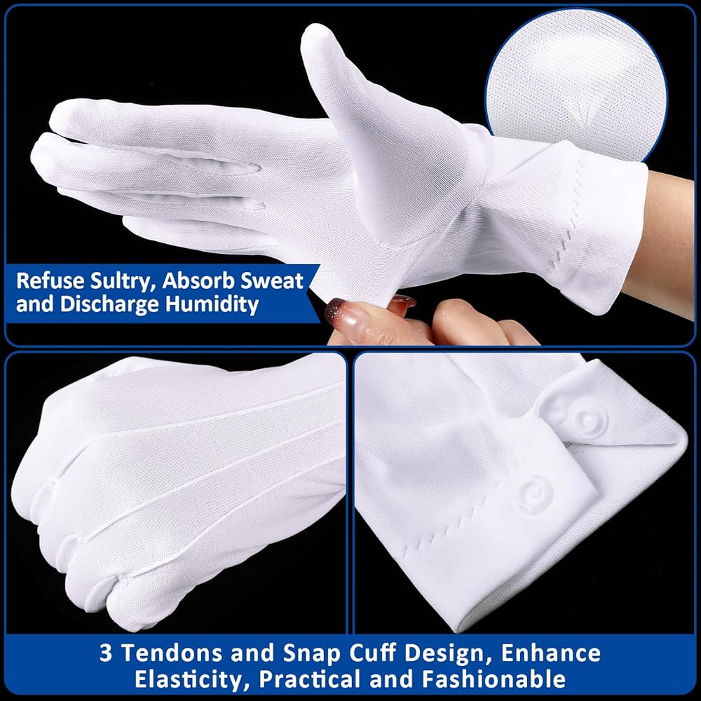 Wide application: these white costume gloves are very suitable for dining, car and motorcycle driving, Santa Claus cosplay, parade, police uniforms, troops, coin jewelry silverware inspection, banquets, some costumes and Halloween costumes, making you look elegant and charming in public and formal occasions