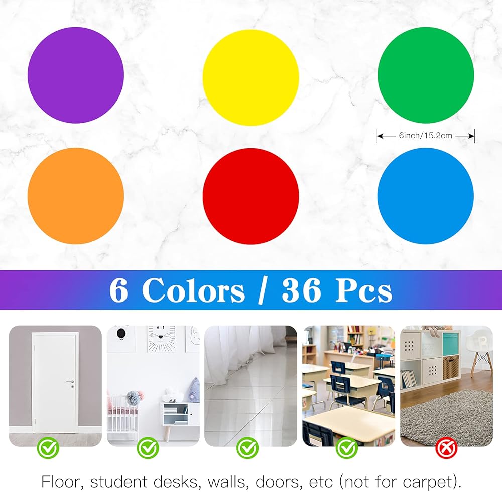 6Inch Vinyl Floor Stickers for Classroom IKAYAS Self Adhesive Dots Line Up Spots 36pcs Removable Decals Markers for Preschool and Kindergarten Elementary 6 Colors