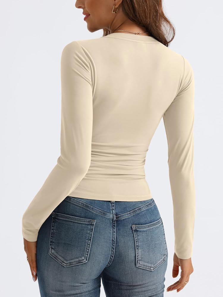 Design: high-stretch fitted style, v neck, long sleeve shirts, tight underscrubs layer, you can wear it regularly or fold it up like a crop top, cute tops, slim fit, casual shirts, y2k style fashion