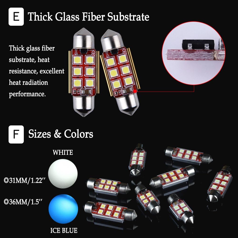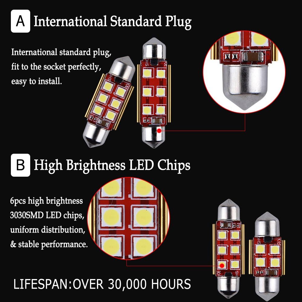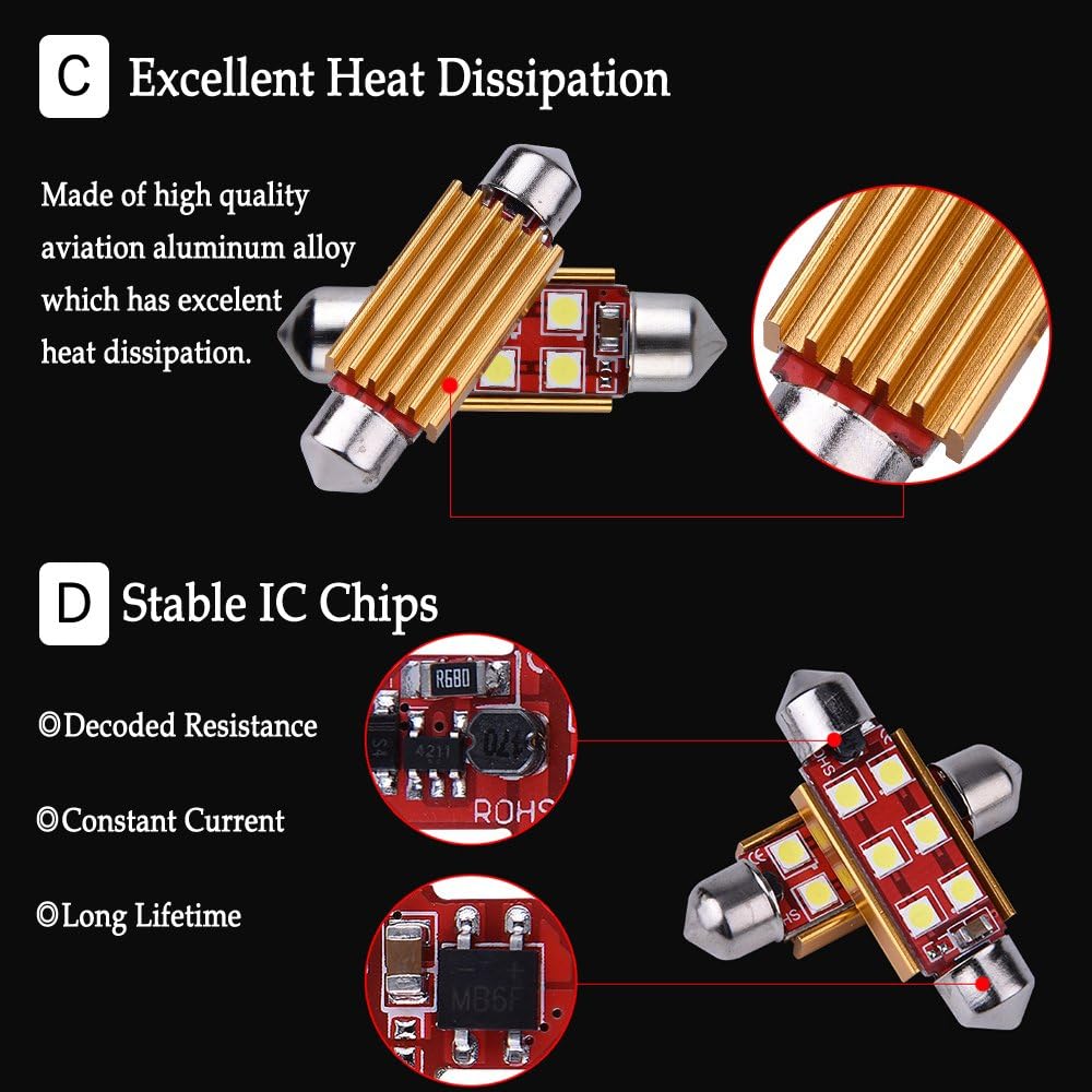 • 【APPLICATION】Dome Light, Reading Light, Map Light, Dashboard Light, License Plate Light, Trunk Light, Courtesy Light, Glove Box Lights, etc...(Cross Reference Number: DE3175,DE3021,DE3023,3021,3022,3175,6428,6430,7065,etc…)