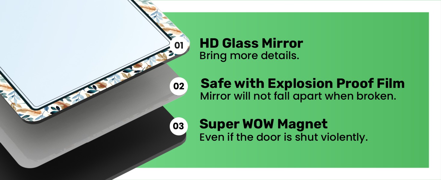 TESTED SAFETY AND STRONG MAGNET BACKING. Safety Backing is a crucial feature to enhance safety in school, gym, office and other environments. In the unlikely event of the mirror breaking, this film acts as a protective barrier, holding the shattered pieces in place and minimizing the risk of injury from falling glass. Additionally, 100% full-size strong magnet ensures a amazing secure attachment.