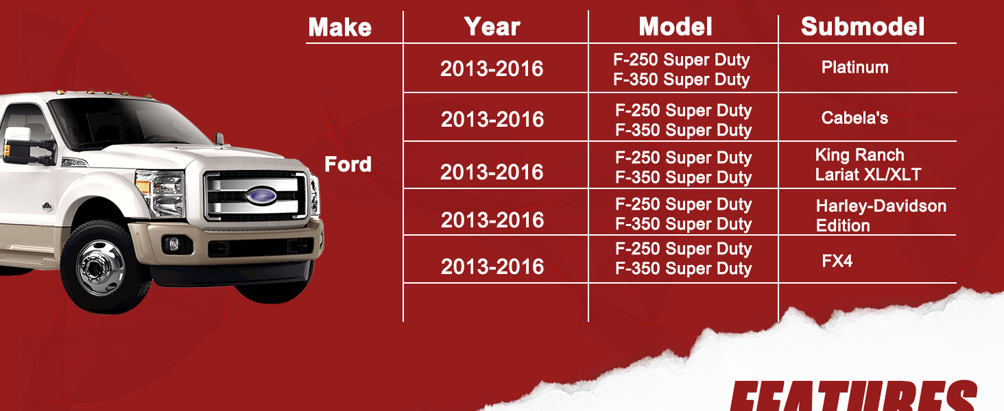 Compatibility With: OE#: KF04060BK. Perfectly fit for 2008-2016 Ford F-250 F-350 2WD and 4WD Super Duty XL, XLT, FX4, Lariat, Platinum, Cabela's, King Ranch, Harley-Davidson Edition