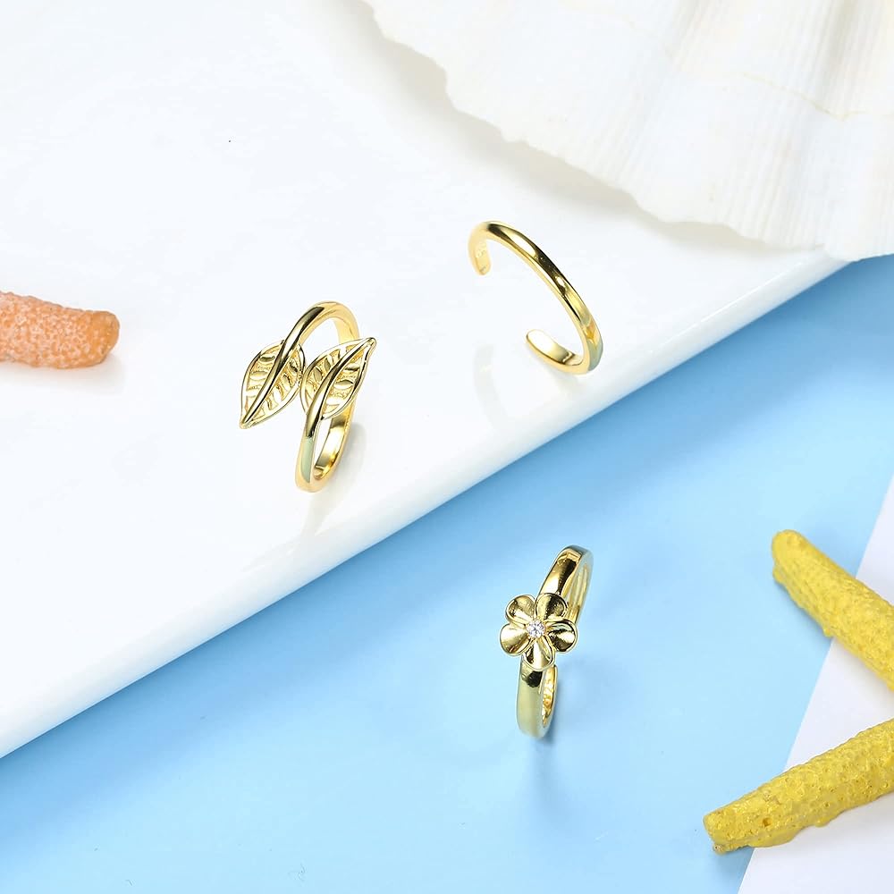 14K Gold Plated Toe Rings For Women 925 Sterling Silver Open Tail Rings Leaf Flower Knuckle Stackable Rings Simple Snake Adjustable Toe Rings Summer Beach Foot Jewelry Set