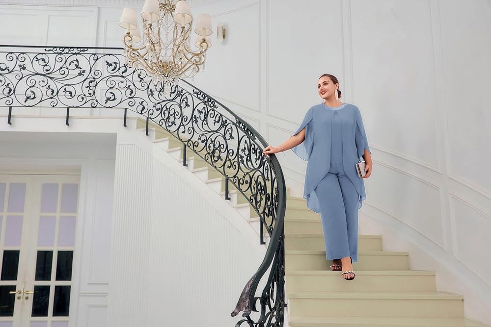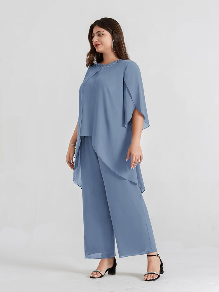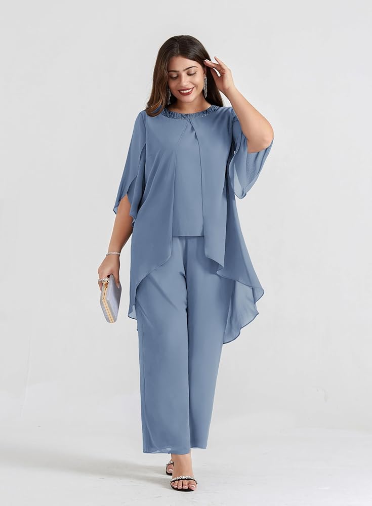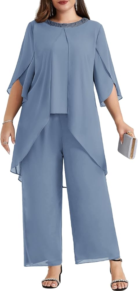 Plus Size 2 Piece Pant Suits: Elegent mother of the bride pant suits has 3/4 sleeve flowy top and wide leg pants, soft chiffon overlay brings you flowy asymmetric hem, the sequin neck is designed to give you extra sparkle, make you look charming and stylish.
