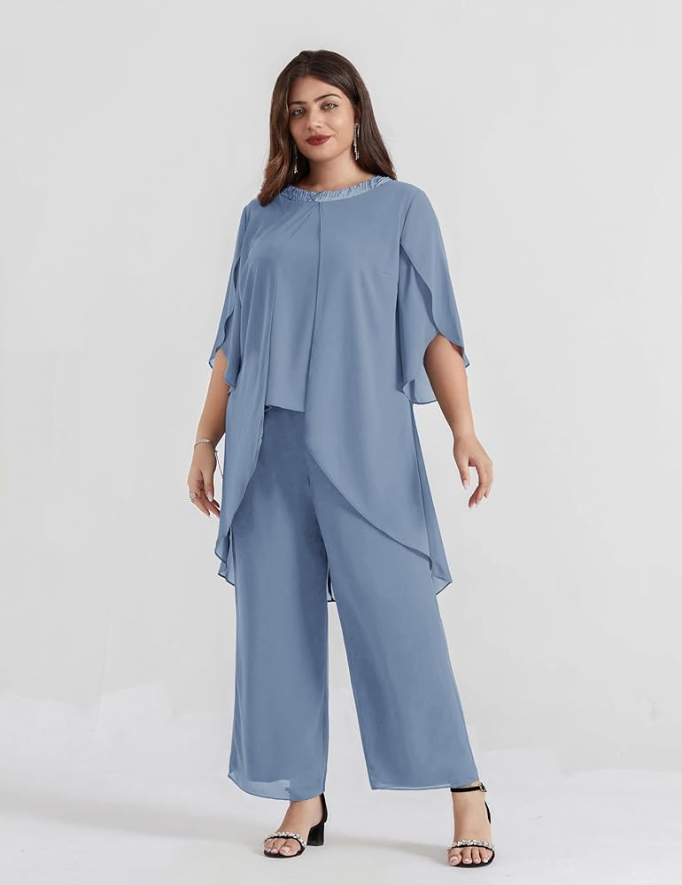 Nice Style: Plus size chiffon pant suits for women features in sequined crew neck, chiffon 3/4 sleeve with slit show great temperament and makes you look stunning in daily life. The elastic waist pants are lined so don't worry see through.