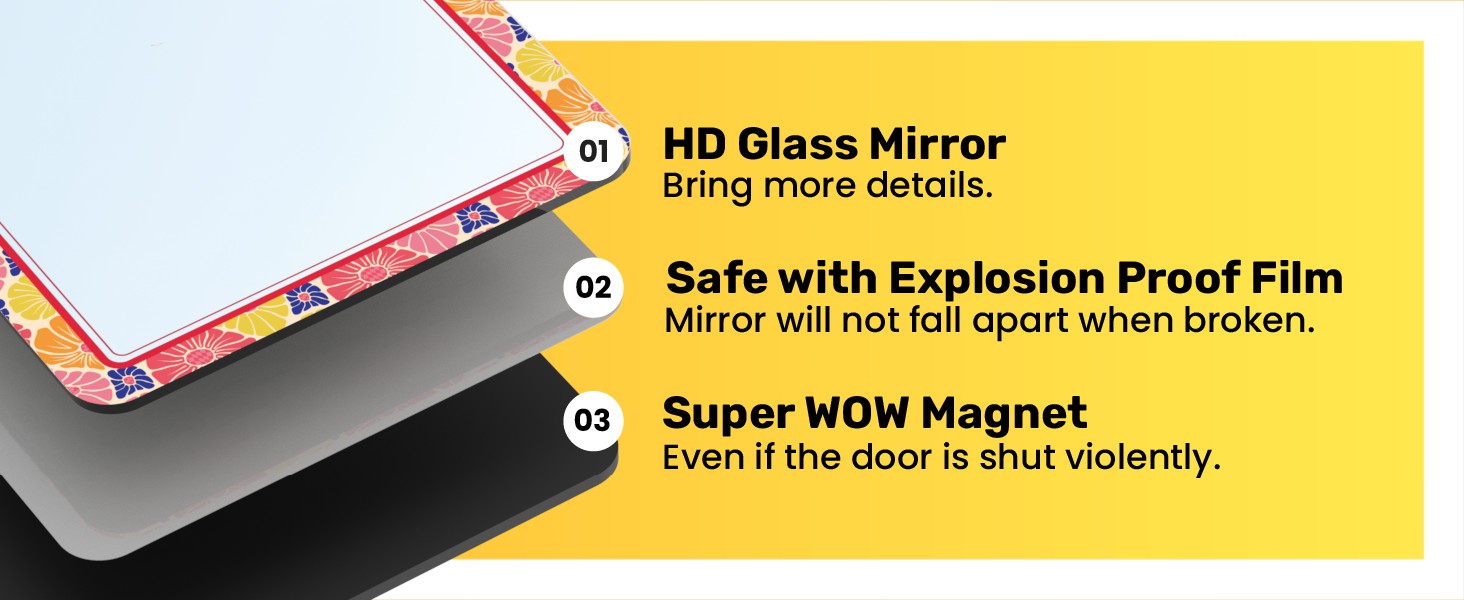 • TESTED SAFETY AND STRONG MAGNET BACKING. Safety Backing is a crucial feature to enhance safety in school, gym, office and other environments. In the unlikely event of the mirror breaking, this film acts as a protective barrier, holding the shattered pieces in place and minimizing the risk of injury from falling glass. Additionally, 100% full-size strong magnet ensures a amazing secure attachment.