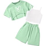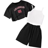Hilinker Girl's Casual Athletic Three-Piece Summer Outfit - Crew Neck Graphic Tee and Cropped Cami with Loose Shorts