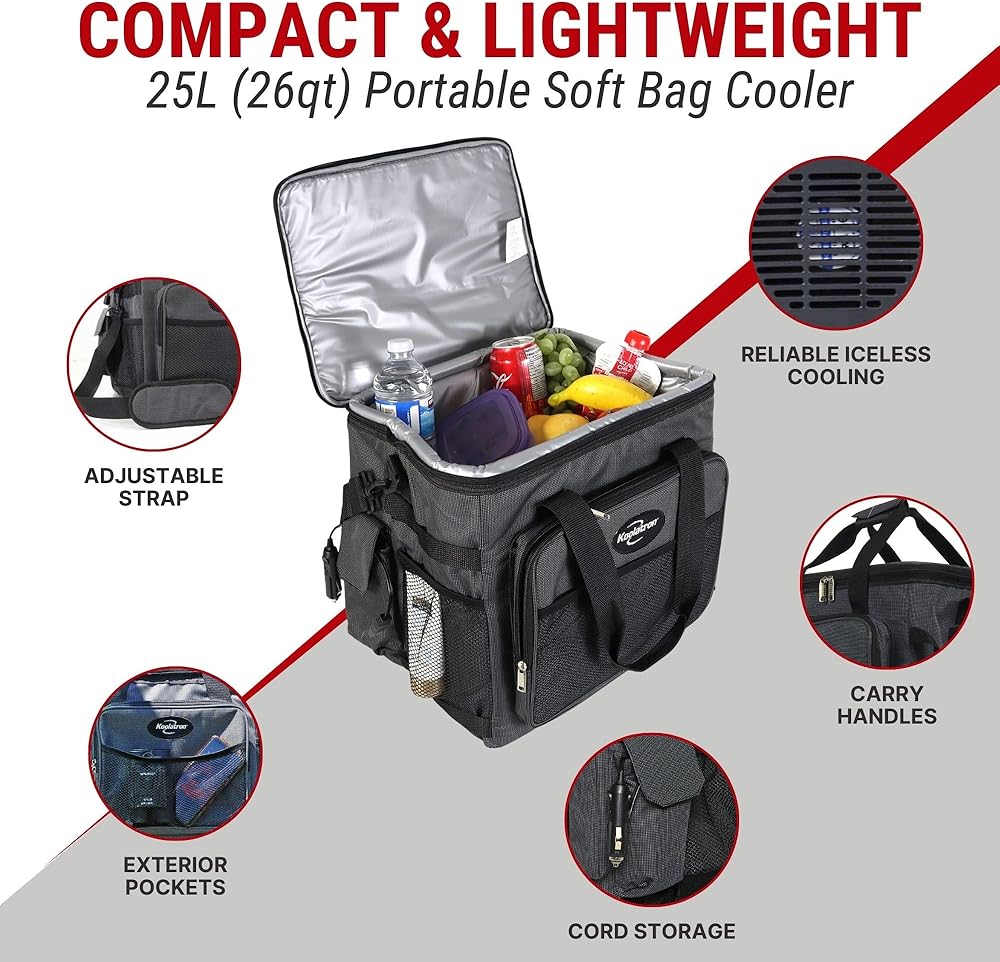 25 L (26 qt) Capacity Cooler: With a 24 liter (26 quart) capacity, this soft-sided cooler bag holds up to 23 standard soft drink cans and collapses when empty for space-saving storage