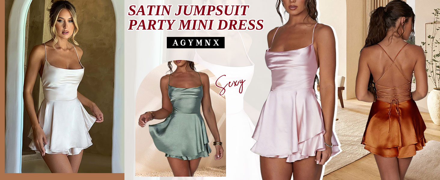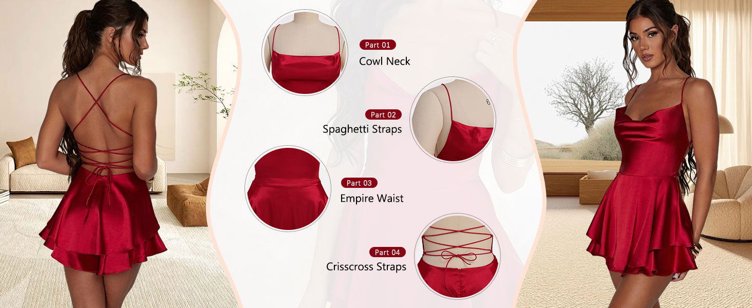 Women Satin Dress: The Summer Dress is made of soft, non-wrinkling, stretchy, lightweight but not see through. Sexy rompers are perfect for summer and with a cardigan during spring and autumn. Solid color cami romper dress, cowl neck, sleeveless, backless, cross tie back. Short formal dresses are the top choice for summer.