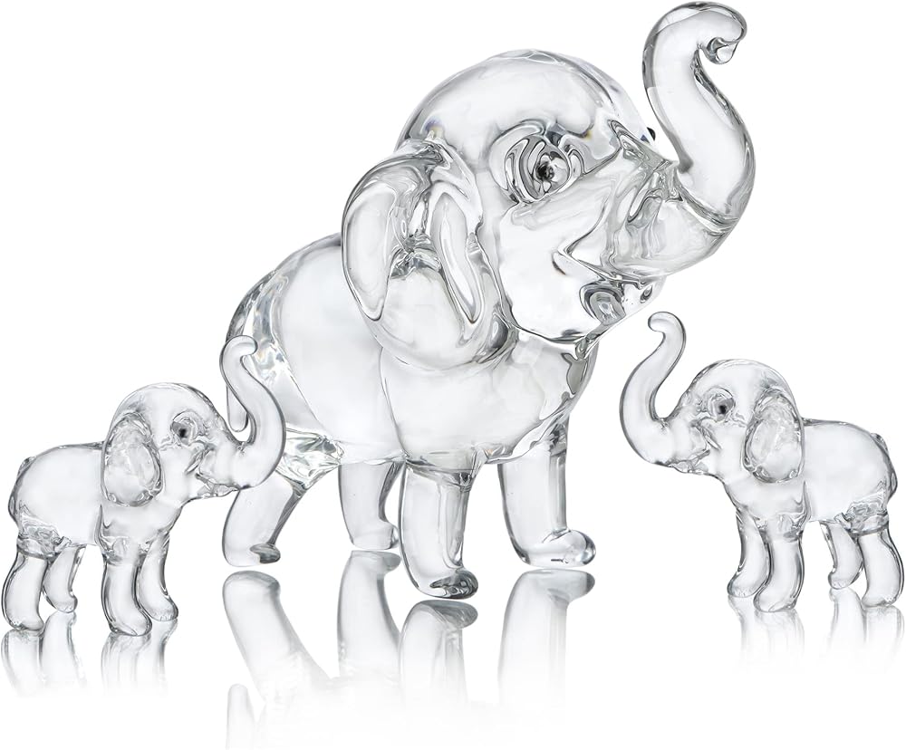HDCRYSTALGIFTS Set of 3, Crystal Elephant Figurines Collectible Lucky Glass Animals Paperweight Ornament Home Decor Table Centerpiece Gift (3.5'' Mother and 2'' Two Babies)