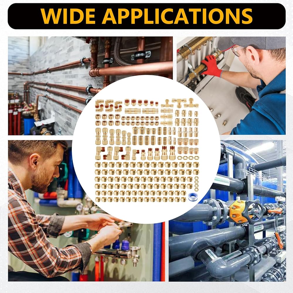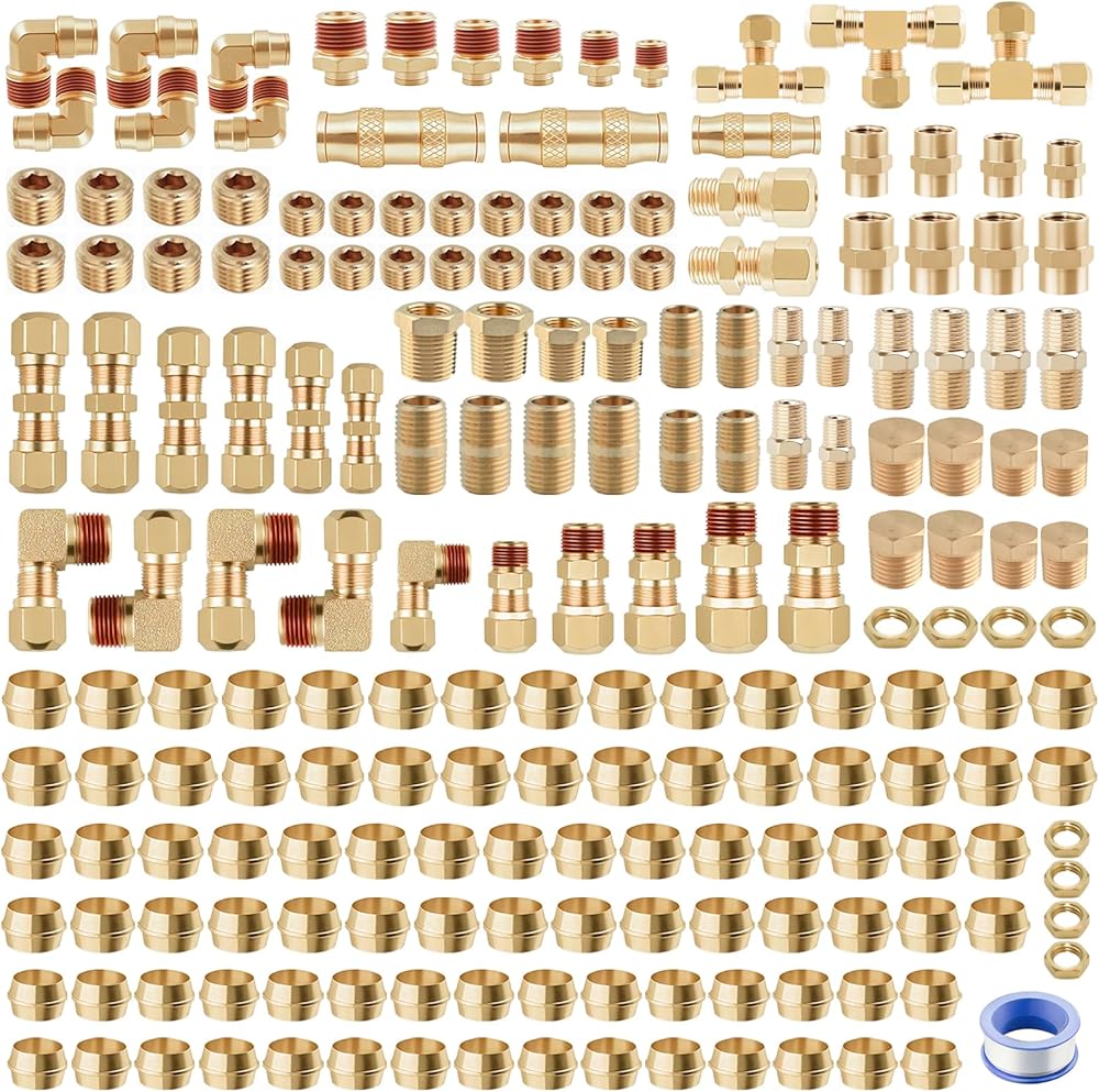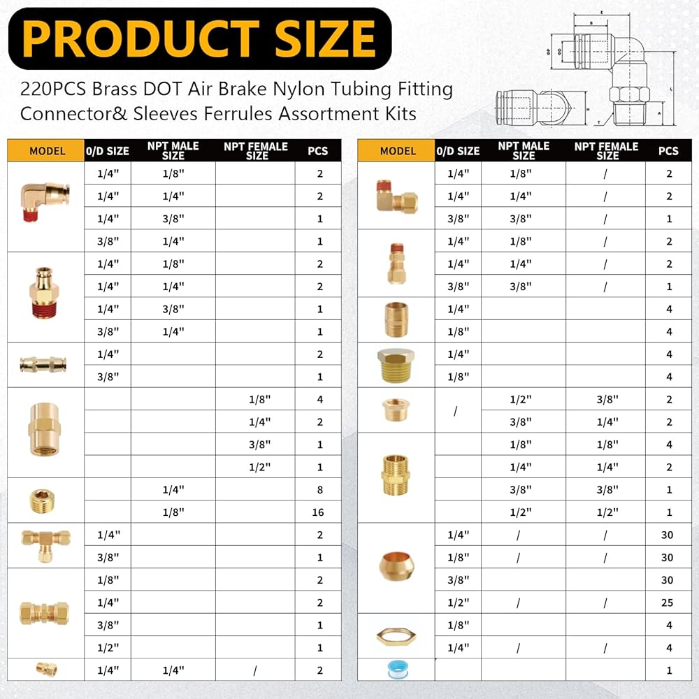111 PCS AIR LINE FITTING KITS: Dot air fittings assortment include 4PCS DOT Union, 2PCS DOT Tee, 6PCS Bushing, 4PCS 90⁰ DOT Male Elbow Connector, 4PCS DOT Straight Male Connector , 2PCS 45⁰ DOT Male Elbow Connector , 2PCS Union Compression,2PCS Tee 1/4" tube x1/8"npt, 2PCS Compression Fittings 1/4" tube x 1/4" NPT Male ,44PCS sleeves ferrules, 13PCS Compression Nut ,44PCS Compression Inserts Tube 1/4",1pc Schrader Valve,1pc 3m teflon tape. Fitting types: 1/4", 3/8", 1/2",1/8"