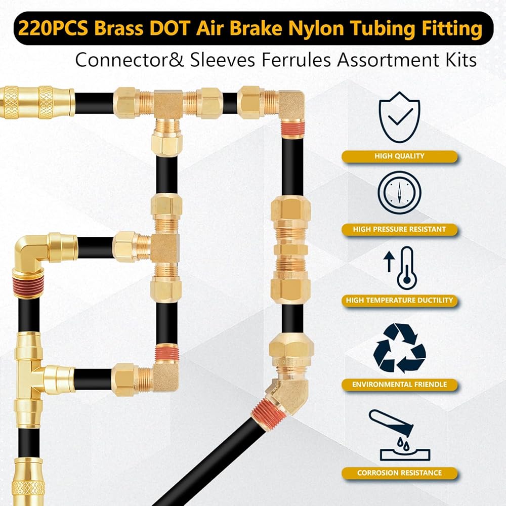 TYPICAL APPLICATION:DOT Air Brake Line Fittings kit can be used with air systems, copper tubing in air lines brake systems, which is perfect for automotive car or truck repair,air operated seats, operating gauges, air horns, industrial workshops, air brake connections,towing machine hose connection and air brake connections or lawn mower repair