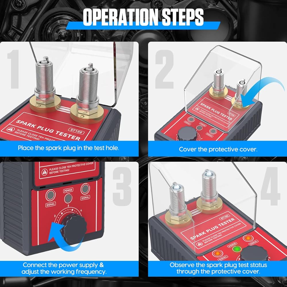 【Easy Operation & Plug and Play】Just put the spark plug into the test hole, close the protective cover, connect the power supply, and turn the button adjust the working frequency to start the test. You can easily and intuitively observe the spark plug test status through the protective cover. Note: The package does not include spark plugs.