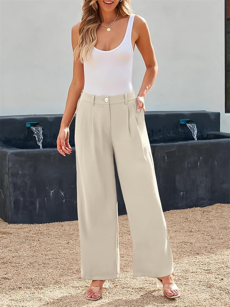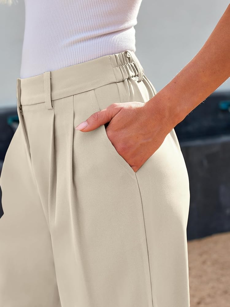 Flattering Wide Leg Design: Featuring a pleated front and side slant pockets, these pants not only enhance your figure but also provide practicality. High waist, Wide legs, Pleated front, Elastic back, Zippered closure, and side pockets.