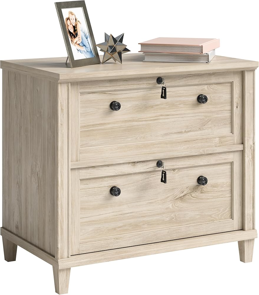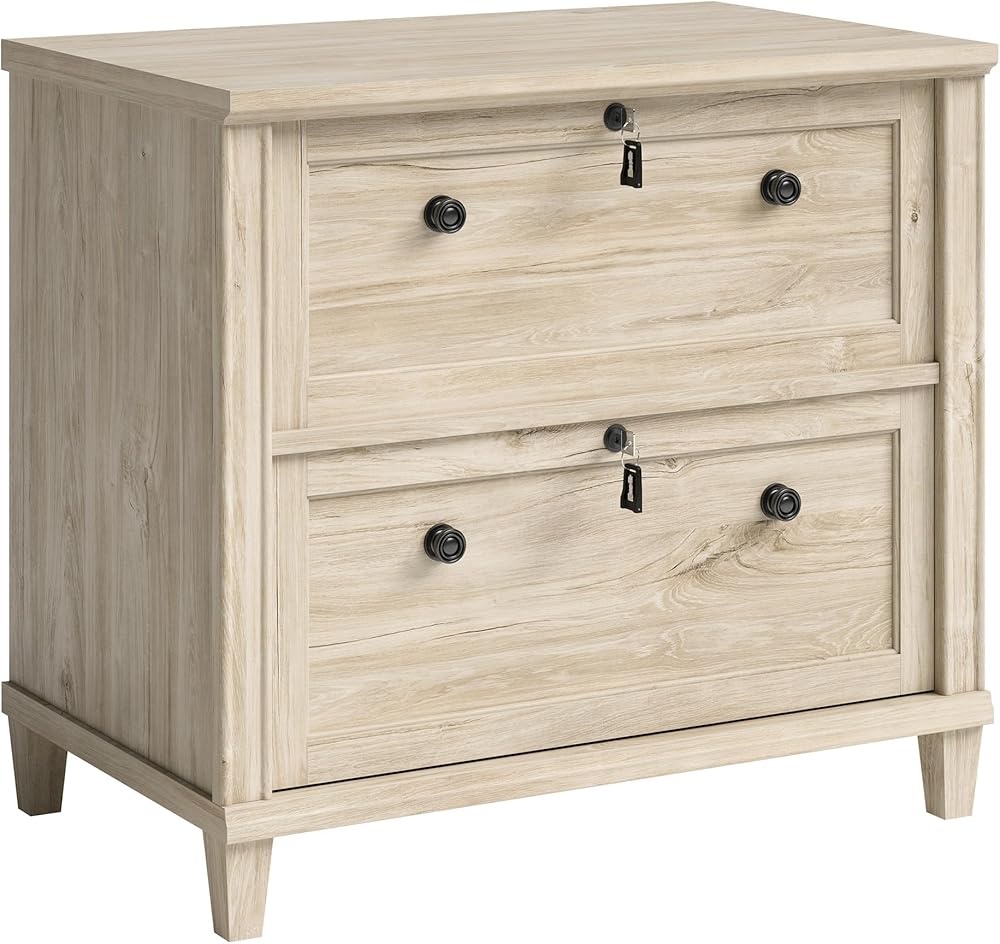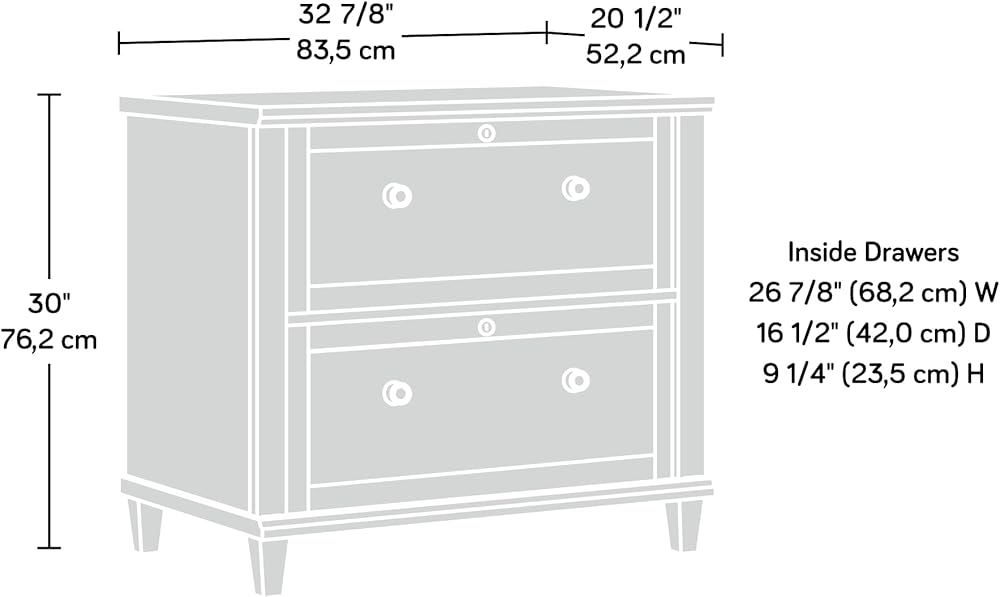 Papers shoved in drawers only to be lost or out of reach when you need them does not sound like the ideal office space. Make sure your important documents are never far from you with this 2-drawer lateral file cabinet from the Hammond® collection. The durable 1" thick top of this 2-drawer file cabinet has room for office décor like a stylish clock, photos of your family or the perfect paper weight. This lateral file cabinet features two drawers with full extension slides that hold letter or legal-size hanging files. You'll have peace of mind knowing your documents are always safe and protected because the file cabinet drawers feature a key lock for secure storage. Safety is always on our minds; therefore, this wood lateral file cabinet is equipped with a safety mechanism that only allows one drawer to open at a time to prevent tip-over accidents. A Chalk Oak® finish and solid wood feet details top off this essential home office item.