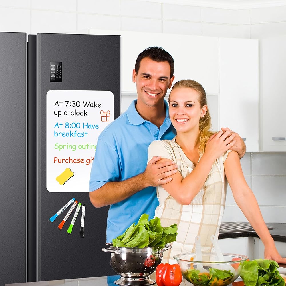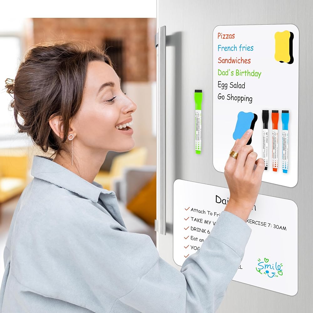 COMPLETE PACKAGE: This magnetic white board set for fridge comes with magnetic write & wipe boards, a single black marker with a built-in eraser, additional dry erase markers in multiple colors, and two erasers with magnets, all of which are magnetized. Whenever we erase the board, it gets squeaky clean, which gives us a clean surface to write on.