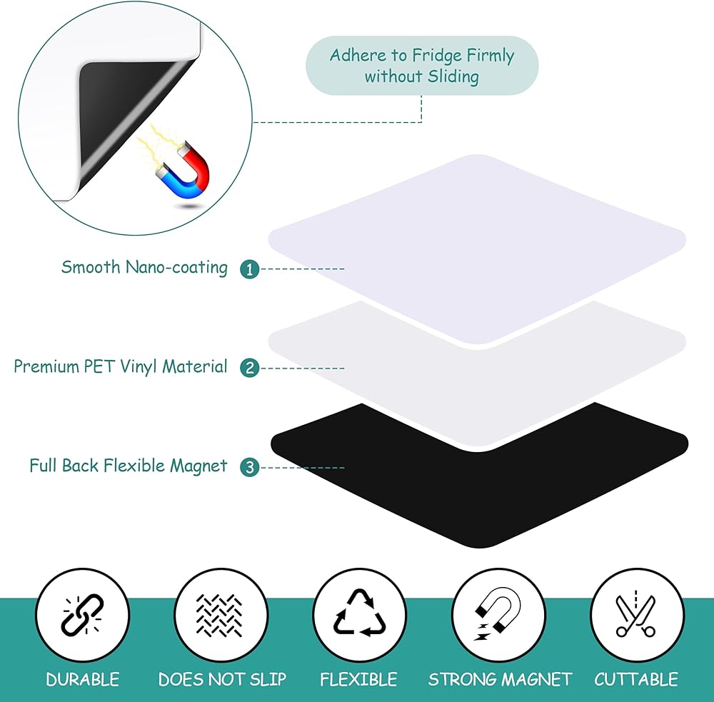 MAGNETIC ORGANIZATION: This dry-erase whiteboard with a fully magnetized backing can firmly stick to your freezer without sliding or falling. The added benefit of being magnetic allows for notices, photos, refrigerator's magnets, or flyers and memos to be easily displayed without the need for pins or tape.