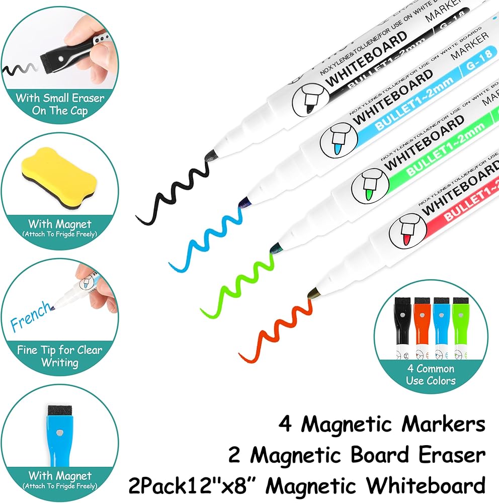 2PCS Small Magnetic Dry Erase Board Sheet for Refrigerator, Fridge Whiteboard for Kitchen, 12"x8" White Board Organizer and Planner with Stain Resistant Technology, Include 2 Eraser, 4 Markers