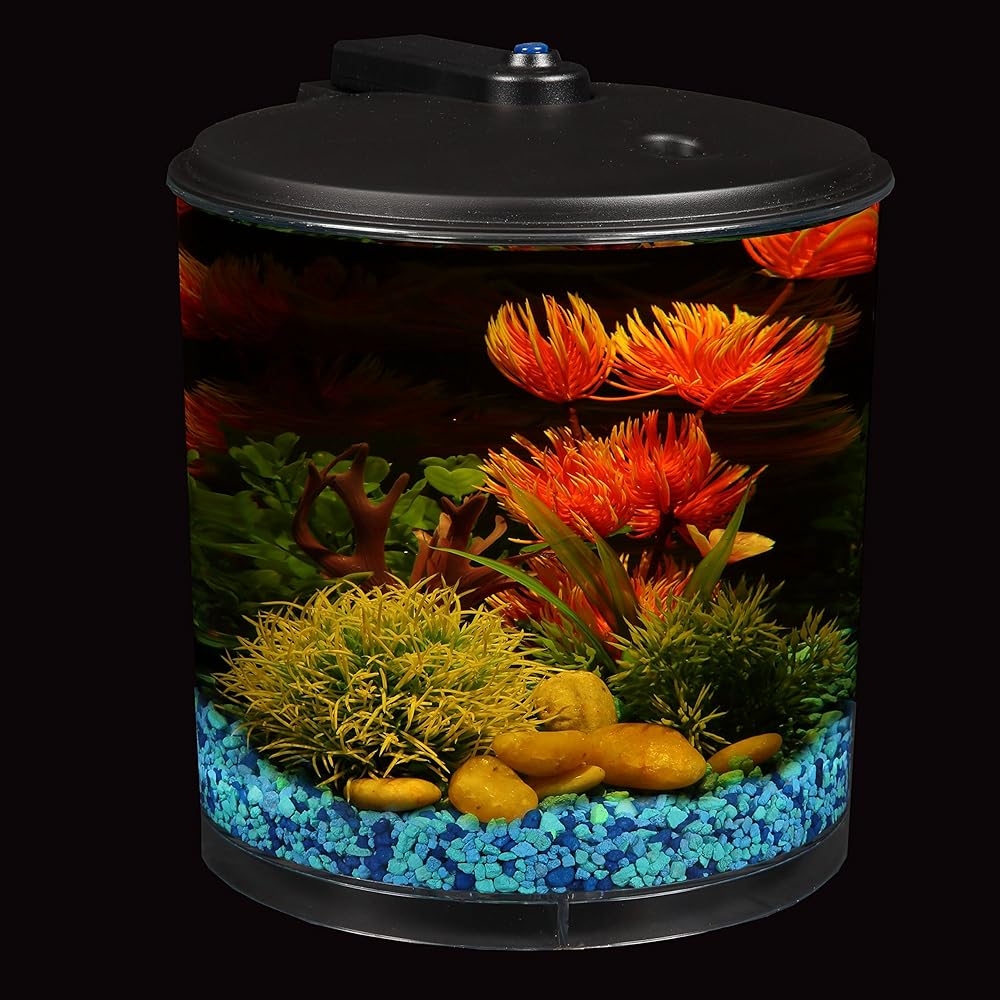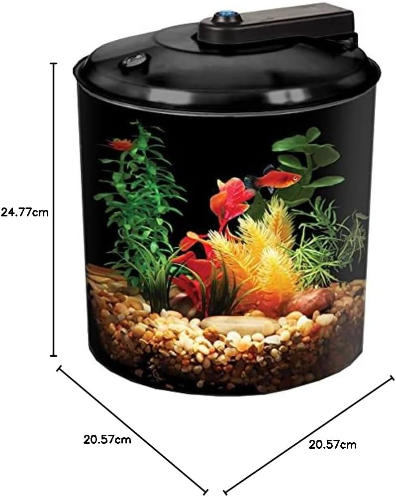 Koller Products AquaView 2-Gallon 360 Aquarium includes energy-efficient LED lighting with 7 color choices plus 4 transitioning and color combinations you can choose depending on the time of day or to enhance your viewing pleasure along with internal power filter that will keep your aquarium water optimal and your fish healthy. This trendy aquarium is designed for easy set up and maintenance. Imagine watching beautiful tropical fish gently swimming back and forth, ideal for helping forget about stress in everyday life. People enjoy watching aquariums as they can be calming and relaxing, as well as a beautiful addition to any home or office. Gravel and decor sold separately. Uses 3 AAA batteries (not included), optional Koller Products 5V Power Adapter (AQ51000) enables light to be plugged into electrical, outlet available on Amazon - item B07C718PHZ. Dimensions: 10.2" DIA x 10.5" H. Includes Koller Products XS filter cartridge (available on Amazon - B08BXTLF31) and User Set Up Guide.