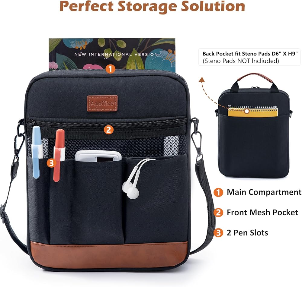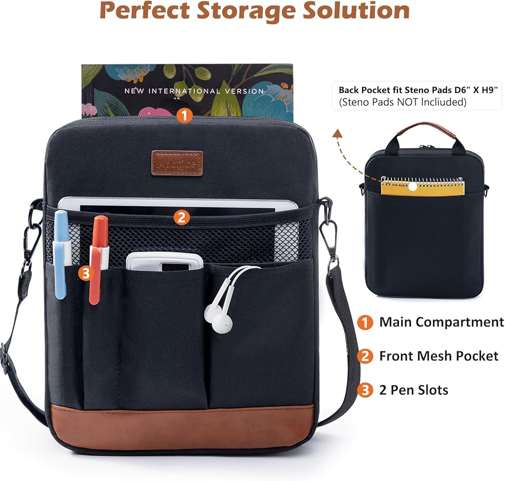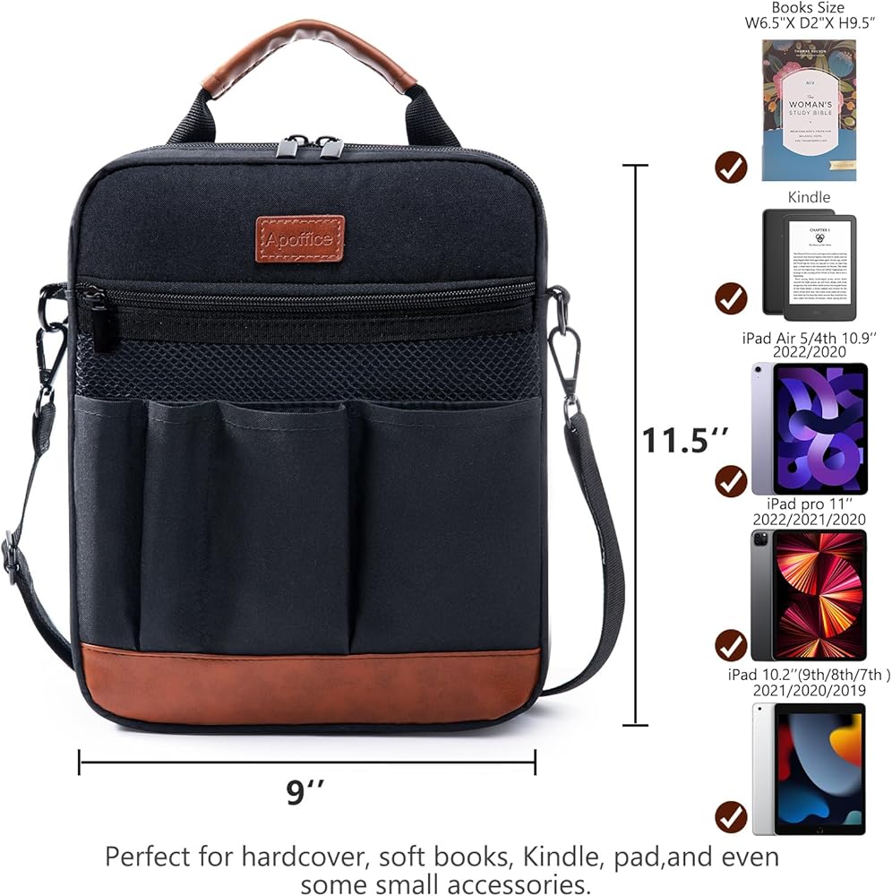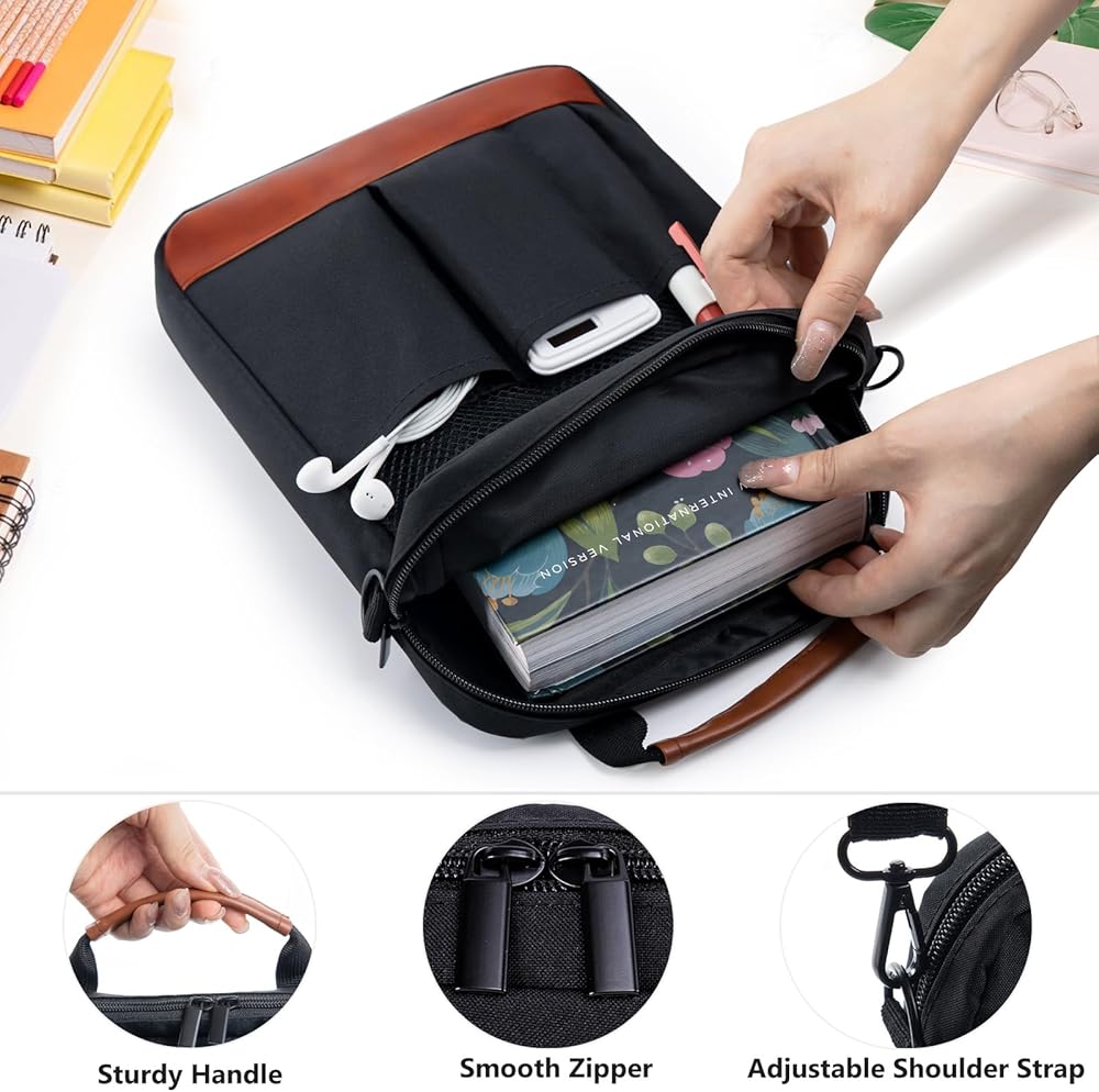 LARGE CAPACITY—With dimensions of 11.5" x 9" x 2", it is suitable for standard or larger-size Bibles, kidles, Ipaads, books, and notebooks. The multiple organizing pockets at the front help keep you more organized.