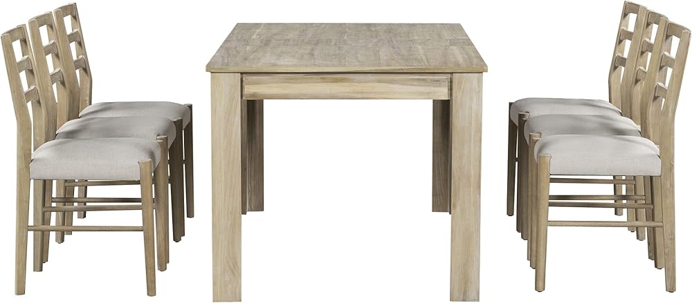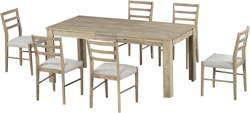 7-Piece Dining Table Set for 6:Enjoy versatile dining experiences with this 7-piece set featuring an adjustable table and six chairs, each equipped with soft cushions. The unique two-tone color combination of antique white and weathered brown finishes adds an elegant touch that complements various decor styles. The table effortlessly expands to accommodate up to 8 people, making it ideal for gatherings and family meals