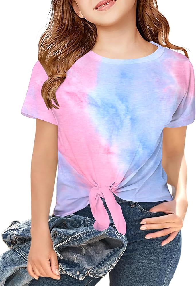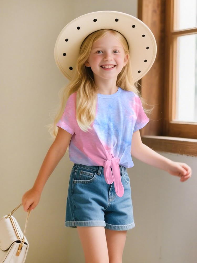 Stylish and trendy: Our girls crop top is the perfect addition to your wardrobe, featuring a tie dye, tie hem, round neck design and rolled cuffs for a fashionable look. The casual and simple design makes it suitable for everyday wear.