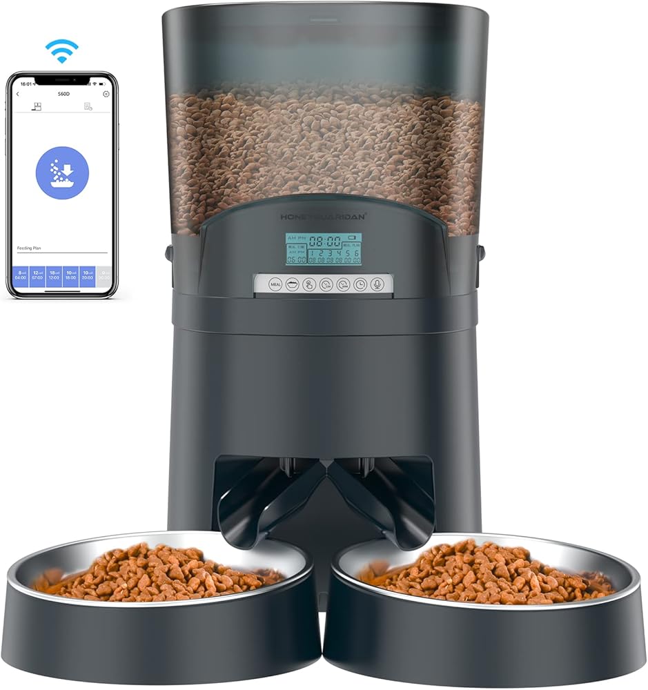 【APP Control & Share Device】Smart cat feeder only supports 2.4G WIFI. It's easy to program and modify pets' meal plans anywhere anytime with APP. You can feed pets by manual feeding and browse the feeding records to check pets fed on on time by HoneyGuaridan APP. You can share device with your family to care about your pets.