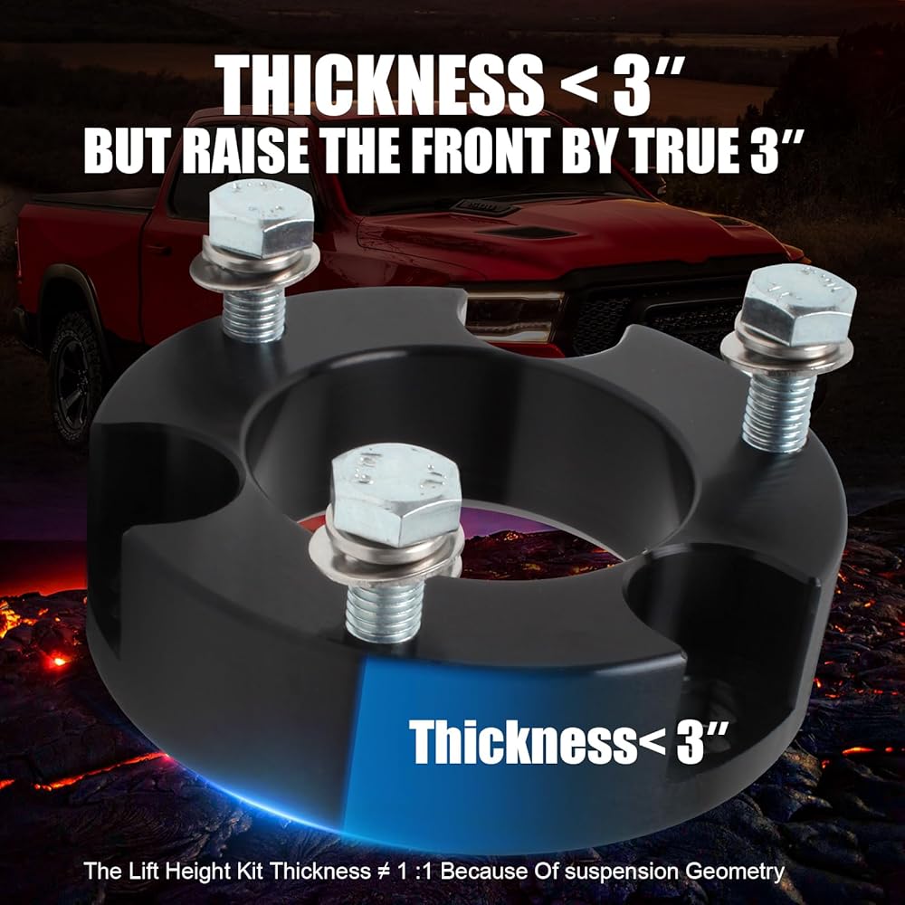 Note - The ratio between lift height and kit thickness is not 1:1, because of suspension geometry. The thickness of front lift kits is less than 3", but the leveling kits will actually raise the truck by 3".