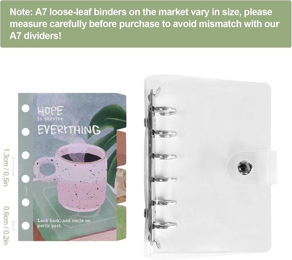 【Dimensions】A6 planner binder measures in 6.8 x 3.5 inches (not including tab size), 6.8 x 3.9 inches (including tab size), thickness is 0.16" (4mm).