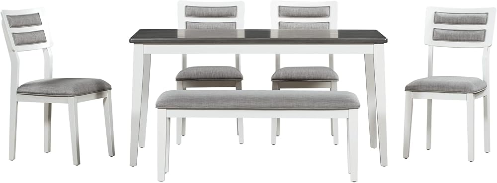 The legs of the table is made of rubber wood, and the tabletop is made of MDF with mindi veneer and it also made the craft effect of wood grain and scratching. The front legs of the four chairs and bench legs are made of rubber wood, while each chair has rubber+plywood backrest and fabric cushion filled with sponge. The back of the chair is made of foam fabric and wood. Besides, There is foot pad at the bottom of each legs of table and four chairs to protect the floor in house.