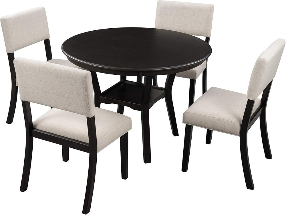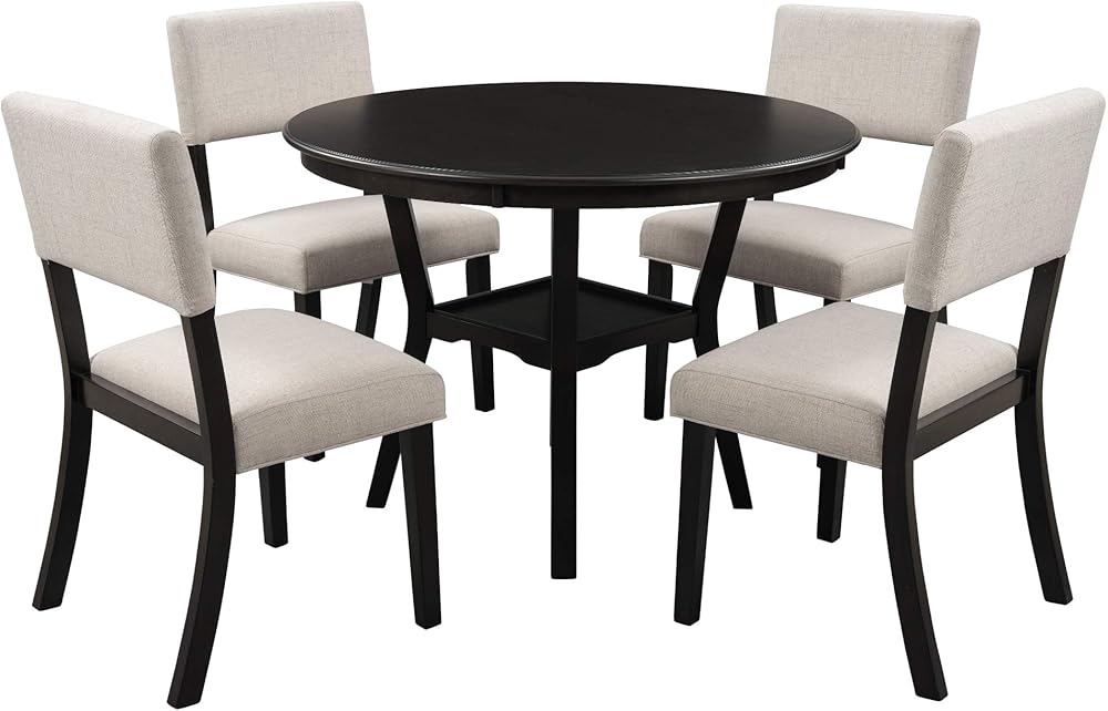 Functional Design with Extra Shelf: The set includes a table and four matching chairs, designed to fit compactly in your space while comfortably accommodating your family. The addition of a bottom shelf enhances practicality, providing a display area for magazines, decorative items, or daily essentials, adding both style and utility to your dining area.