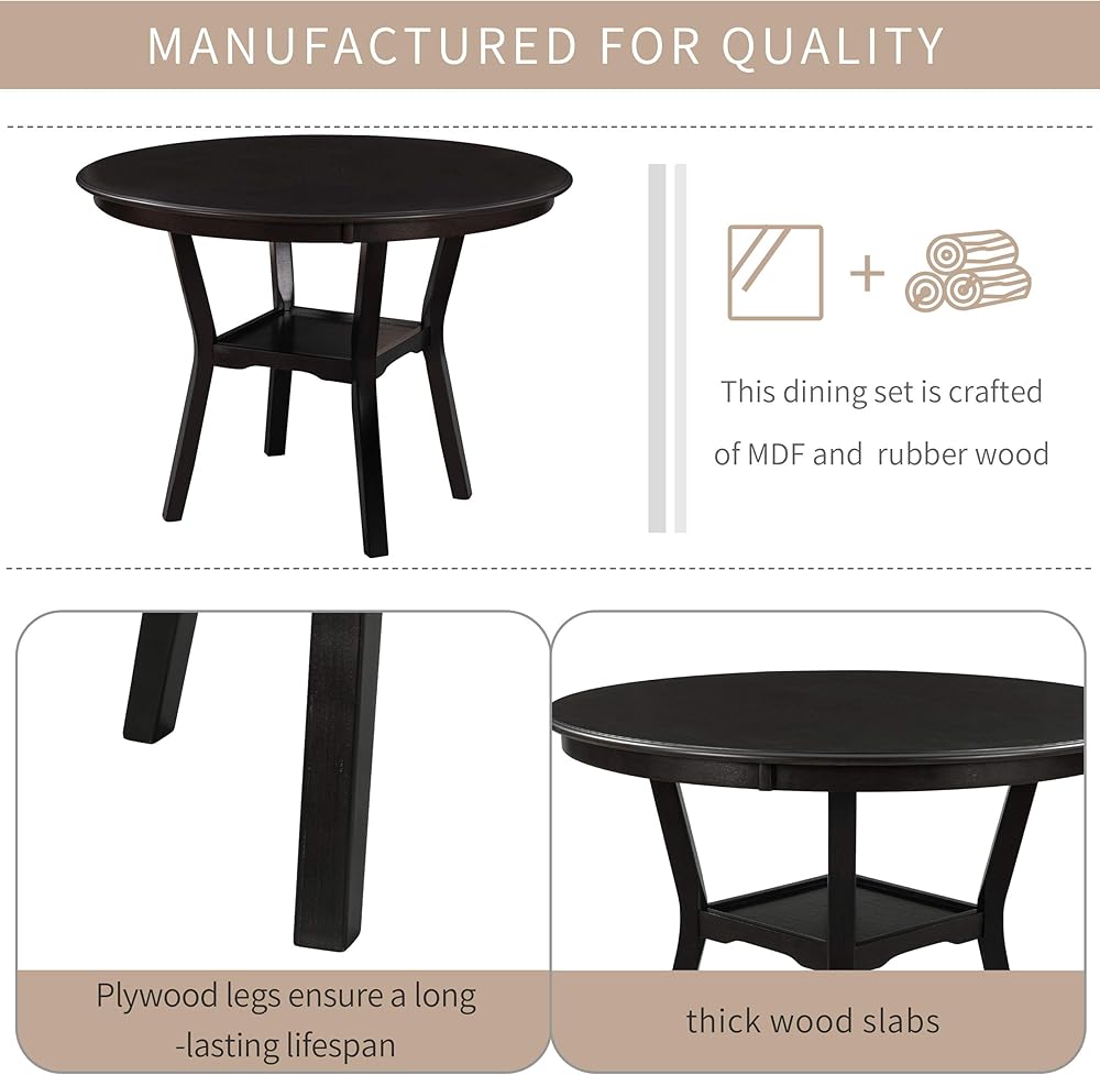 Quality Construction:Crafted from MDF (Medium-Density Fiberboard) and rubber wood, with plywood legs, this dining set is built to last. The tabletop and hidden shelving underneath are made from thick wood slabs, ensuring strong weight capacity and durability. A resistant veneer protects against daily wear and erosion, maintaining the set's appearance over time.