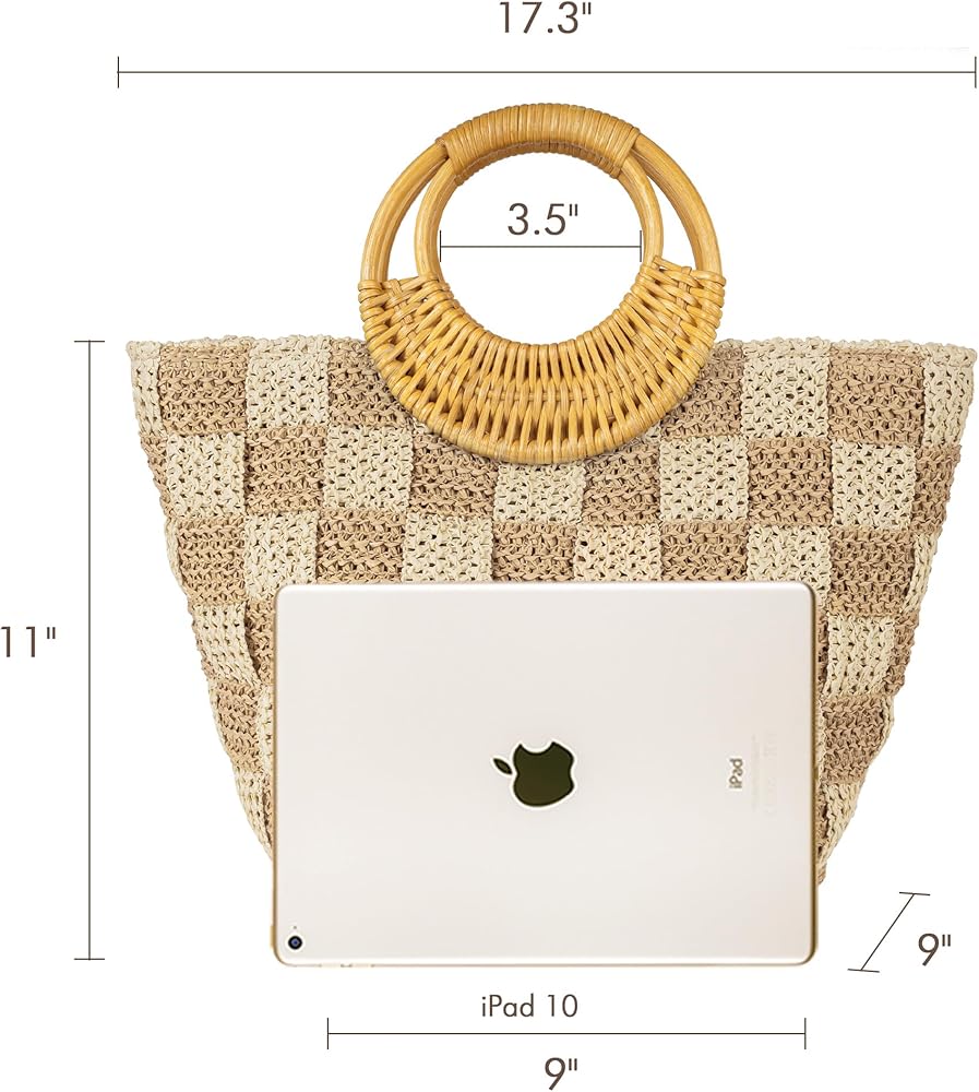 [ Dimension ] The beach tote's opening measures 17.3”, the bottom length is 9”, the width is 9”, the height is 11”, and the inner diameter of the bamboo round handle is 3.5”.