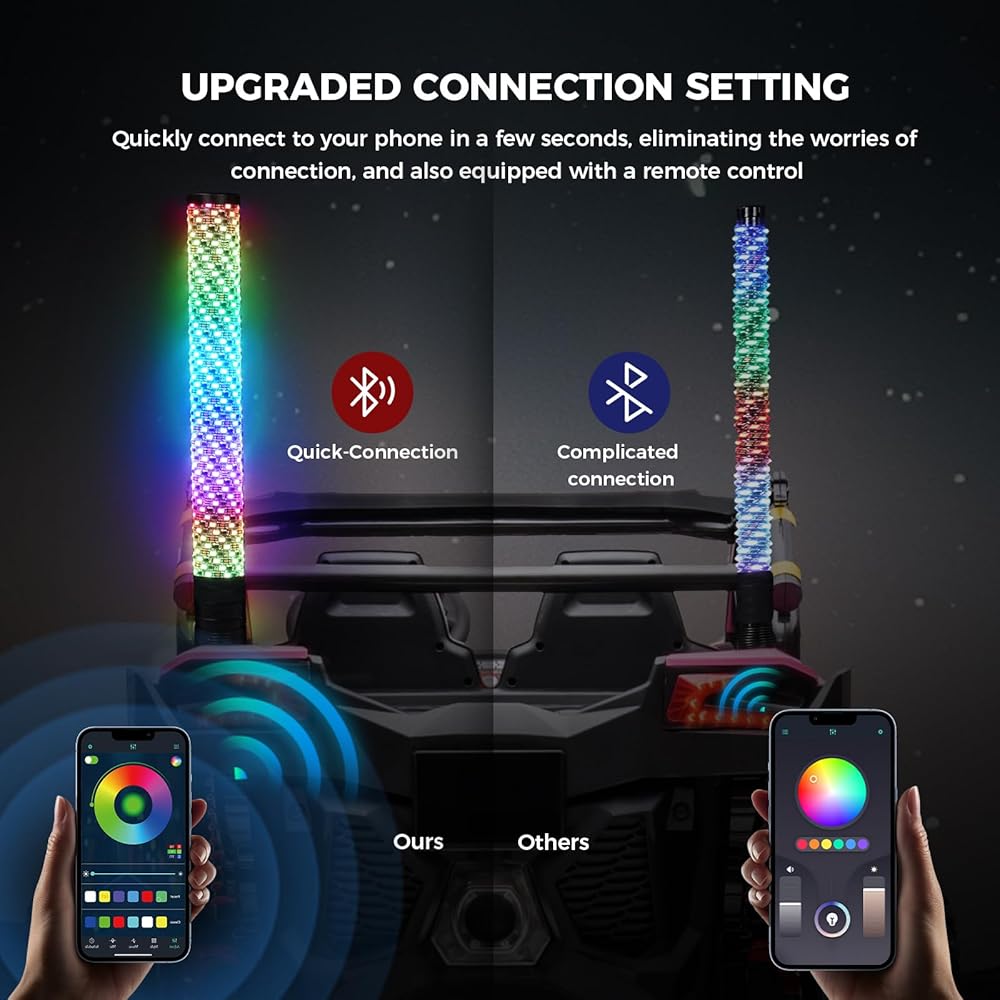 One to One Remote ControI: Avoid interference from others' remote controIs by setting your lighted whips into one to one remote controI mode. You can also pair with others when you remove the one to one remote controI mode.