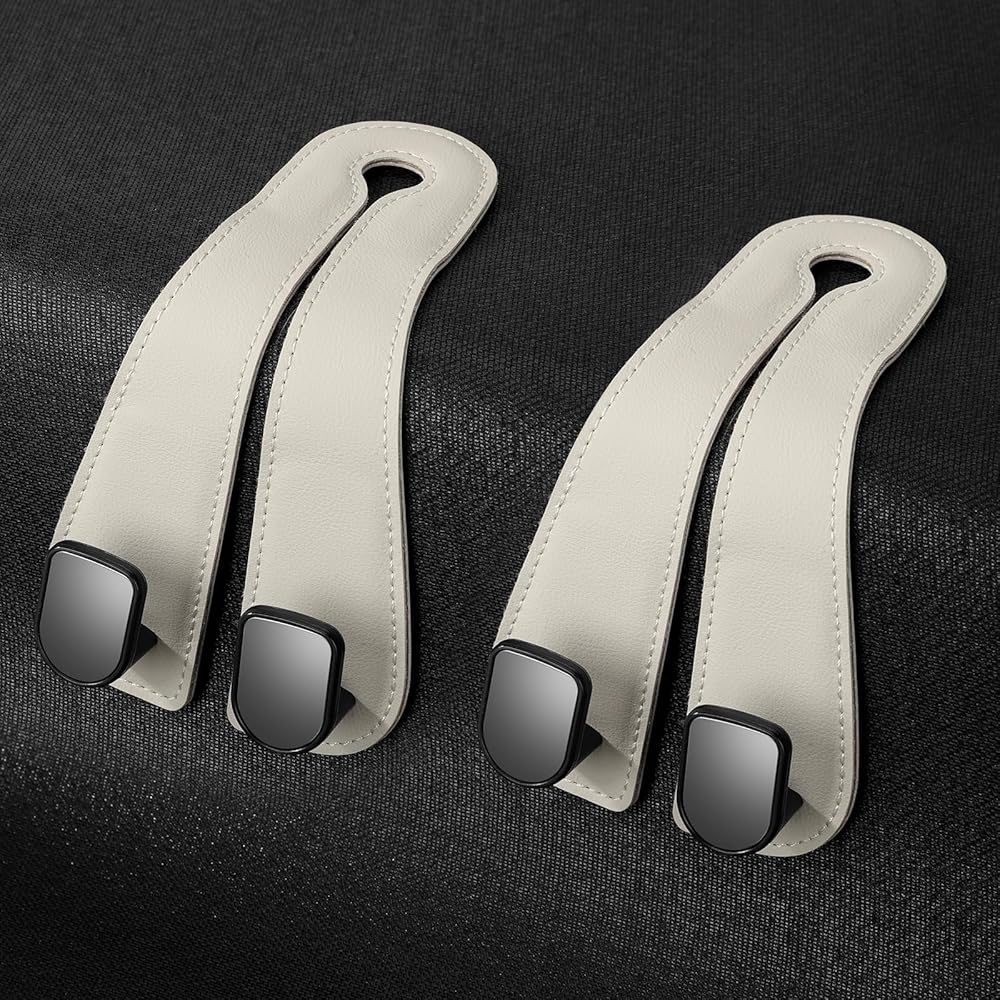 2025 Automotive Seat Back Hooks,Leather Car Seat Hooks,Dual Headrest Organizer Hangers for Purses, Bags & Phones, 2 in 1 Car Headrest Hidden Hook for Tidy Organization,Pack of 2(Ivory White)