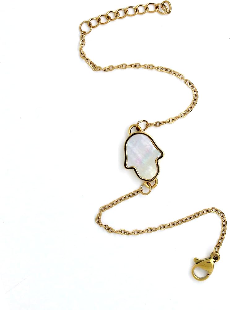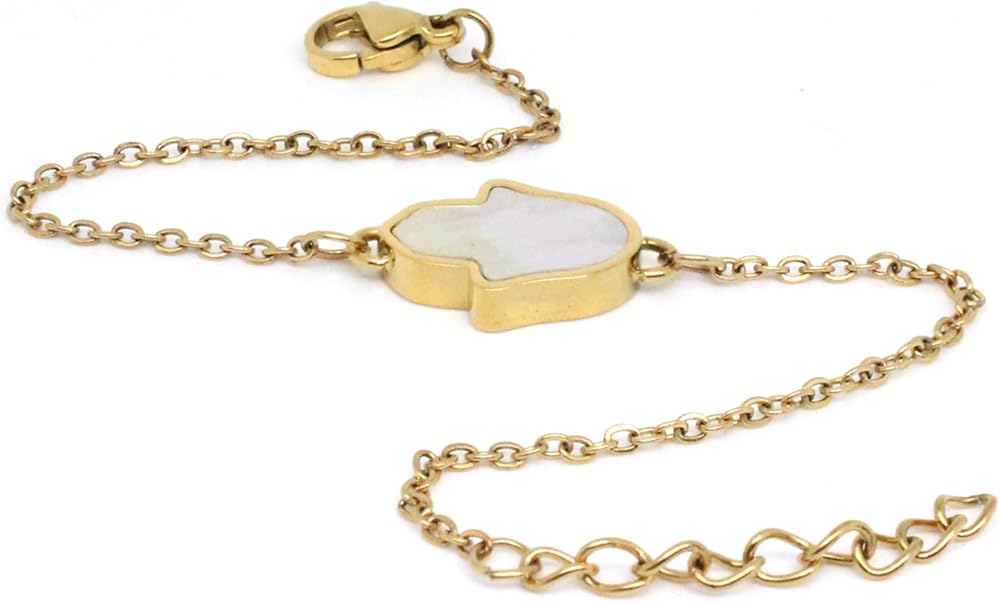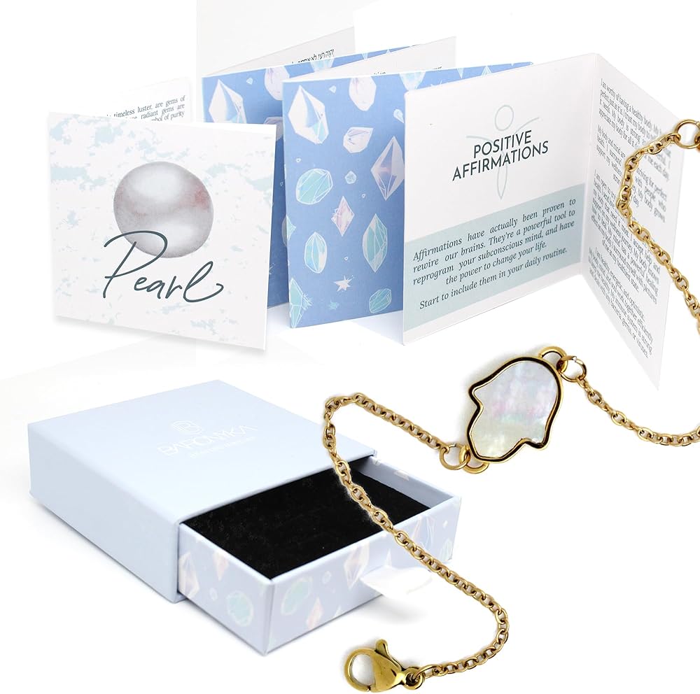 This lovely cable chain bracelet makes a thoughtful gift for mindfulness and well-being. Its hamsa pearl bead pendant symbolizes protection, health, and positivity, while the included healing cards offer inspiration for meditation, affirmations, and good faith. Crafted from durable stainless steel with an 18k gold plating, this bracelet features a delicate cable chain design for comfortable wear. Measuring approximately 7 inches in total length including the 1 inch extension, it allows for subtle adjustments. The hamsa pendant itself measures 19mm wide by 12mm tall and is about 3mm thick, accenting the bracelet with its smooth real pearl inset. Presented beautifully in a gift box, this bracelet uplifts the mood and spirit with its meaningful symbolism.