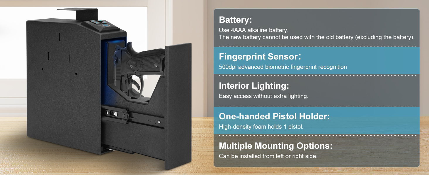 THREE WAYS OF OPENING:1.The gun safe adopts the newly upgraded high-resolution 508DPI biometric technology, which can quickly match fingerprints in less than 0.2 seconds, and can store up to 30 different fingerprints. 2. The safe has a four-digit backlit keypad that can set a 4-8 digit PIN code. 3. The safe has two emergency keys. When opening the gun safe for the first time, please use keys and don't put the spare keys in the gun safe